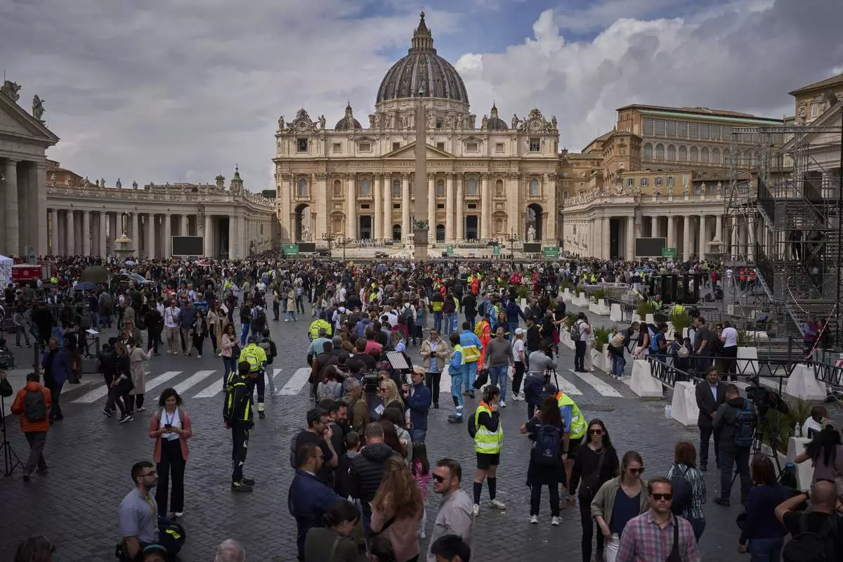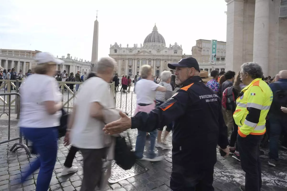 Faithful are channeled in St. Peter's Square at the Vatican, Wednesday, April 23, 2025 as the body of the late Pope Francis will lie in state inside St. Peter's Basilica for three days. (AP Photo/Markus Schreiber)