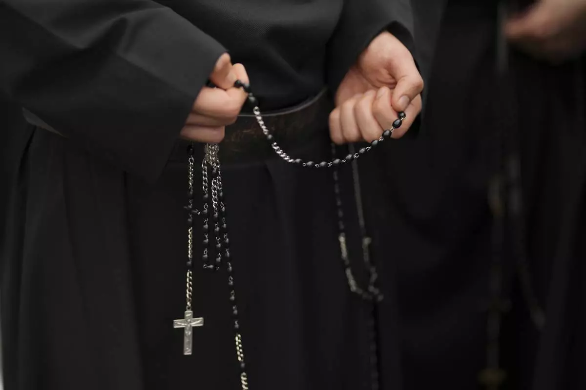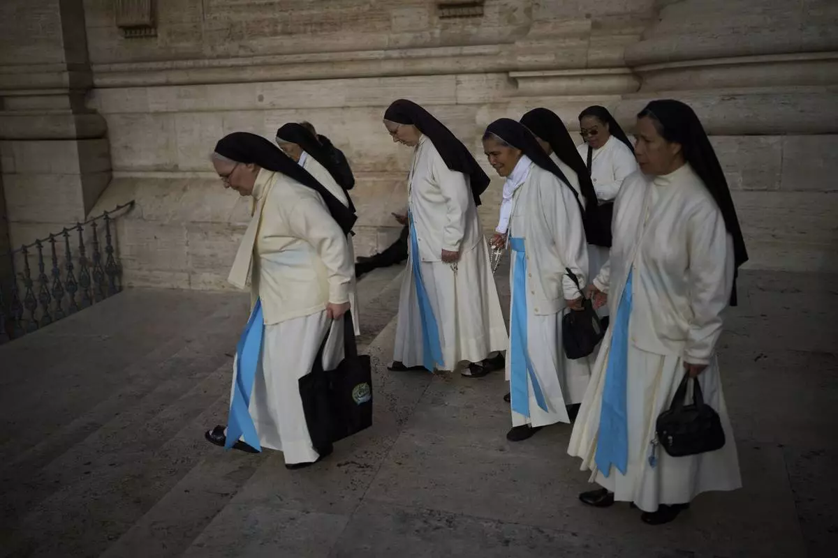 Nuns walk towards St. Peter's Baslica where Pope Francis is lying in state, at the Vatican, Thursday, April 24, 2025. (AP Photo/Markus Schreiber)