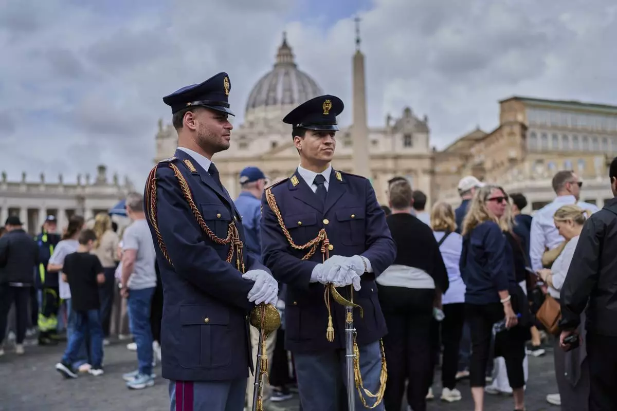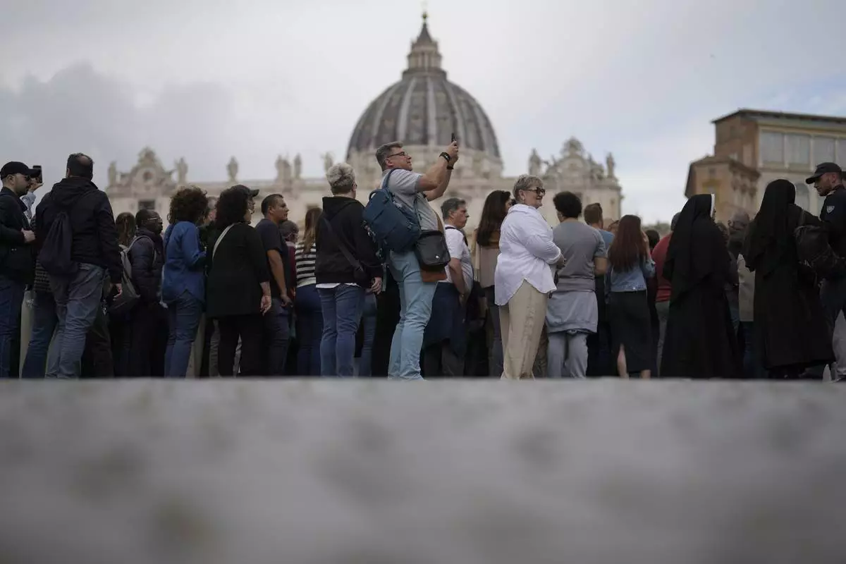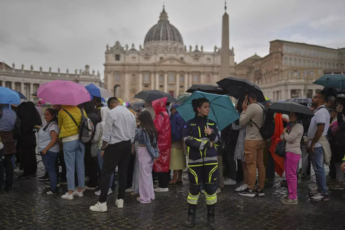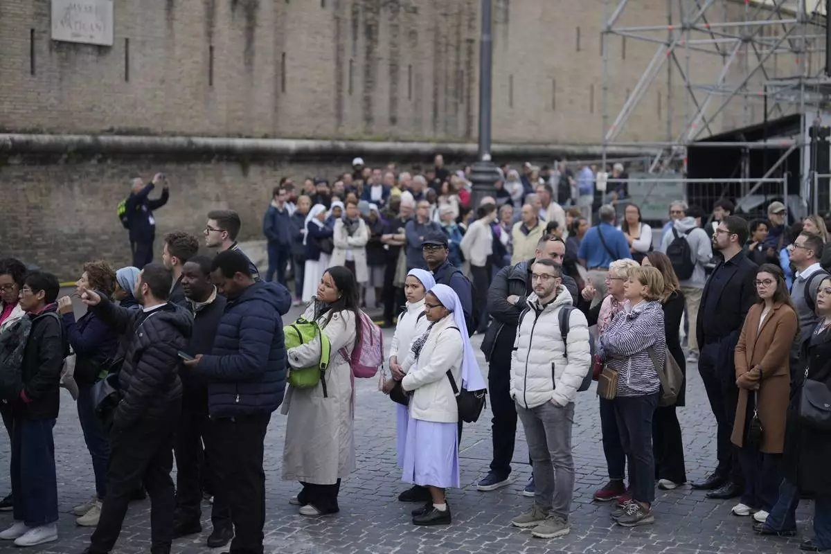 People wait behind a Police line in St. Peter's Square at the Vatican, Wednesday, April 23, 2025 as the body of the late Pope Francis will lie in state inside St. Peter's Basilica for three days. (AP Photo/Markus Schreiber)