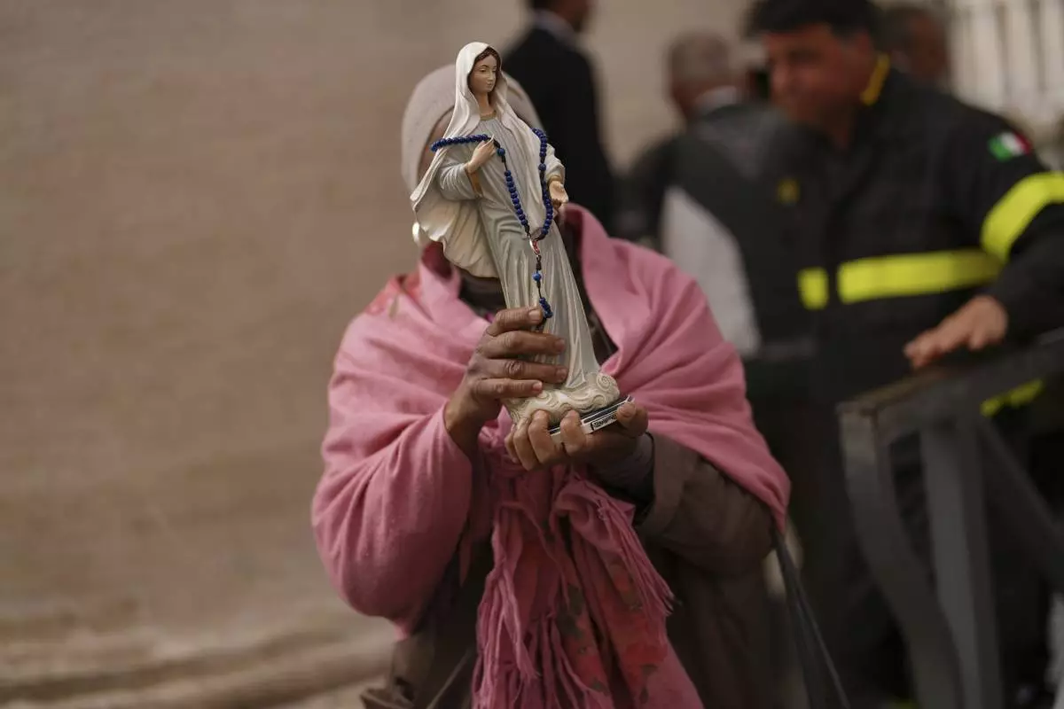 A faithful holds up a statue as she waits in line to view Pope Francis lying in state inside St. Peter's Basilica, at the Vatican, Thursday, April 24, 2025. (AP Photo/Francisco Seco)