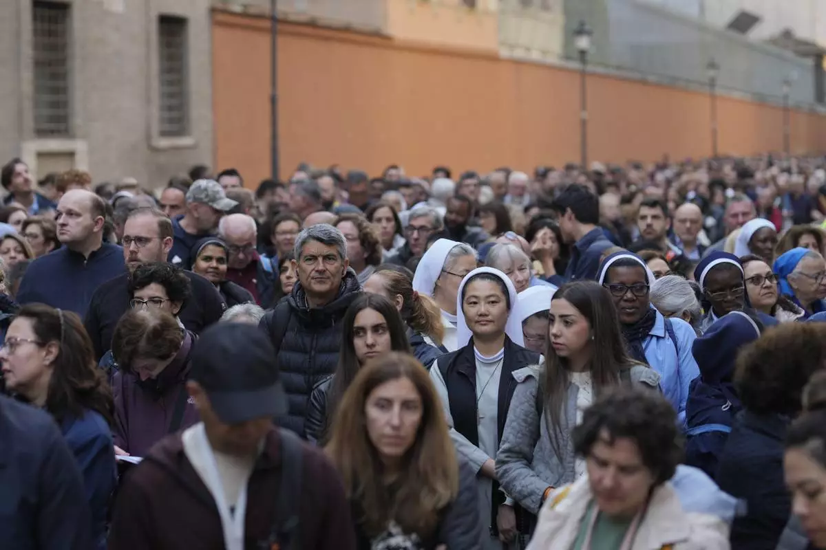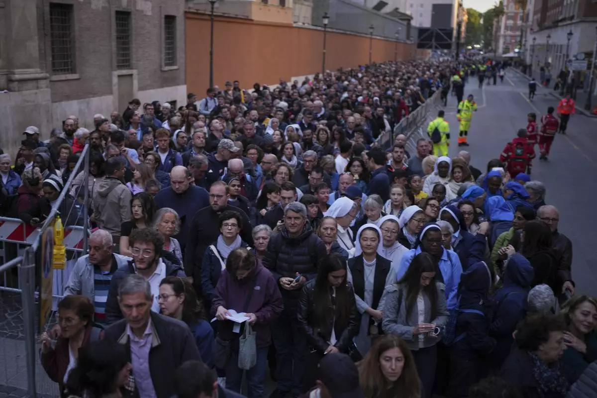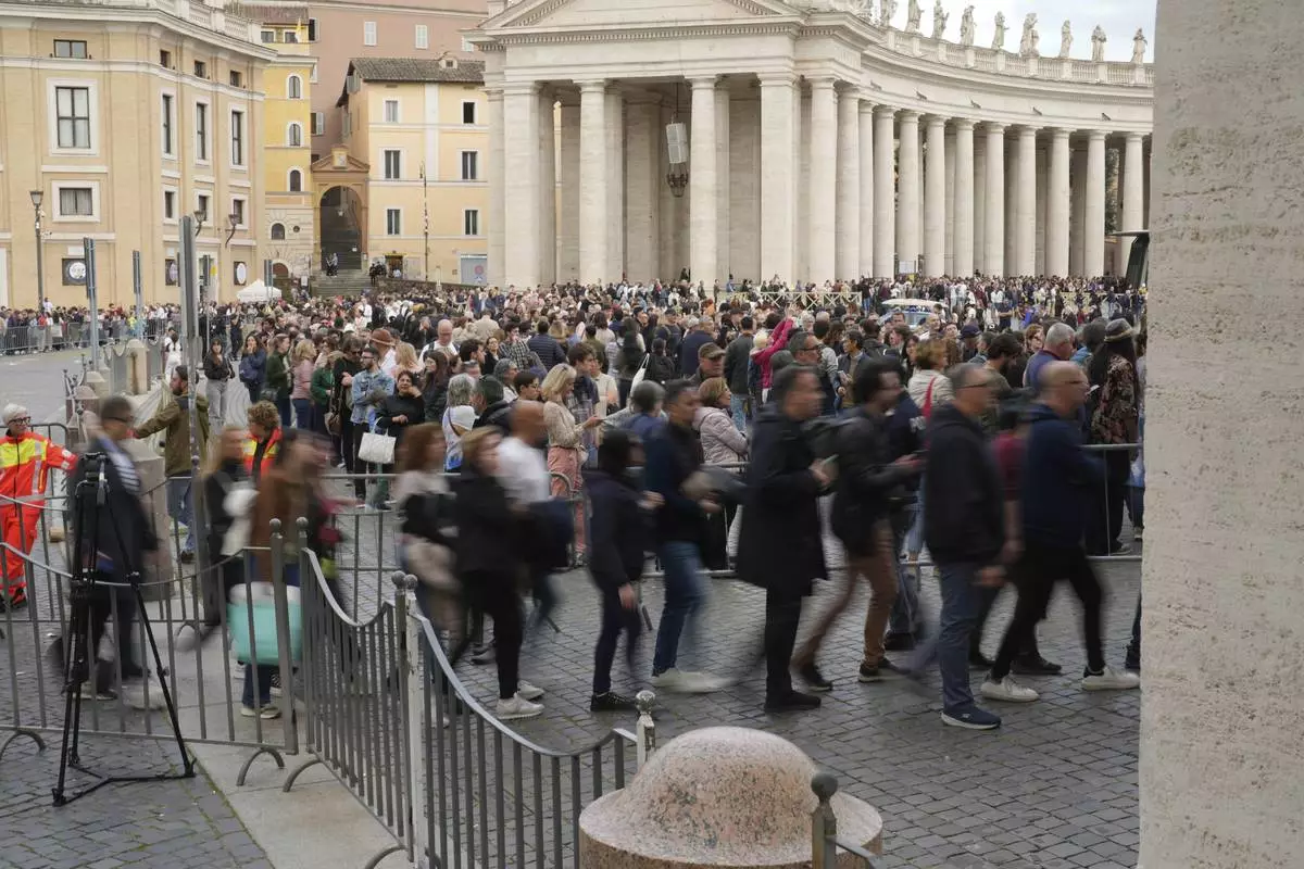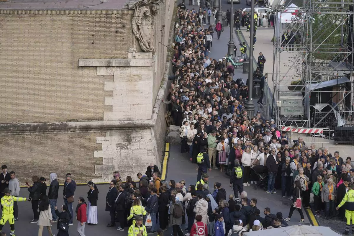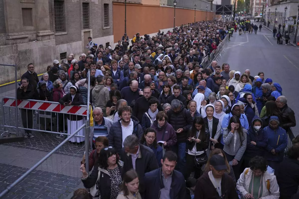 People queue to pay their respect to the late Pope Francis, who will lie in state at St. Peter's Basilica for three days, at the Vatican, Wednesday, April 23, 2025. (AP Photo/Emilio Morenatti)