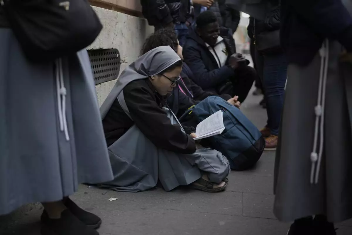 A nun reads a book as she waits in line with others to view Pope Francis lying in state inside St. Peter's Basilica, at the Vatican, Thursday, April 24, 2025. (AP Photo/Markus Schreiber)