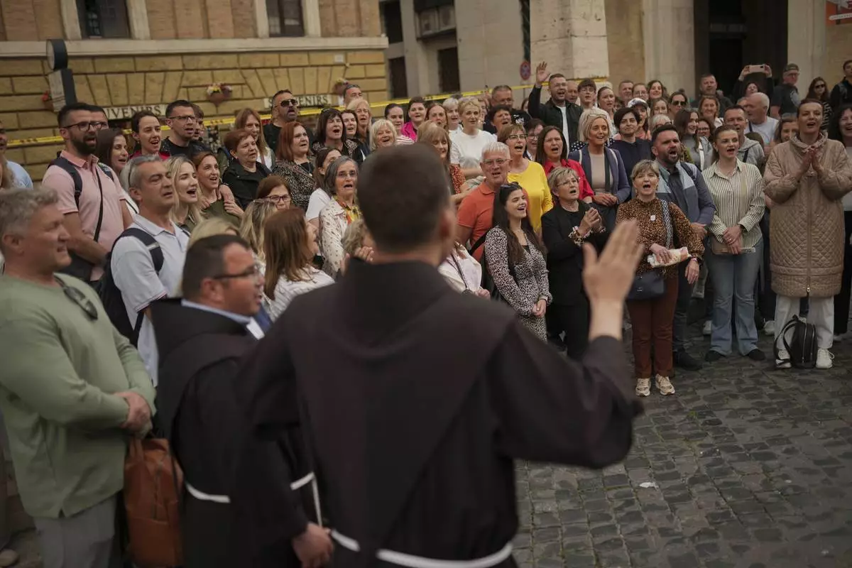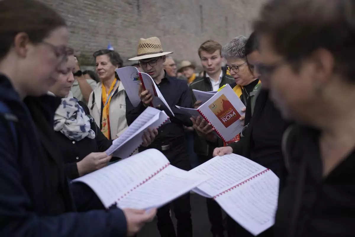 A chorus of people sing religious songs near St. Peter's Square to enter the Vatican, Wednesday, April 23, 2025, as the body of the late Pope Francis will lie in state inside St. Peter's Basilica for three days. (AP Photo/Francisco Seco)