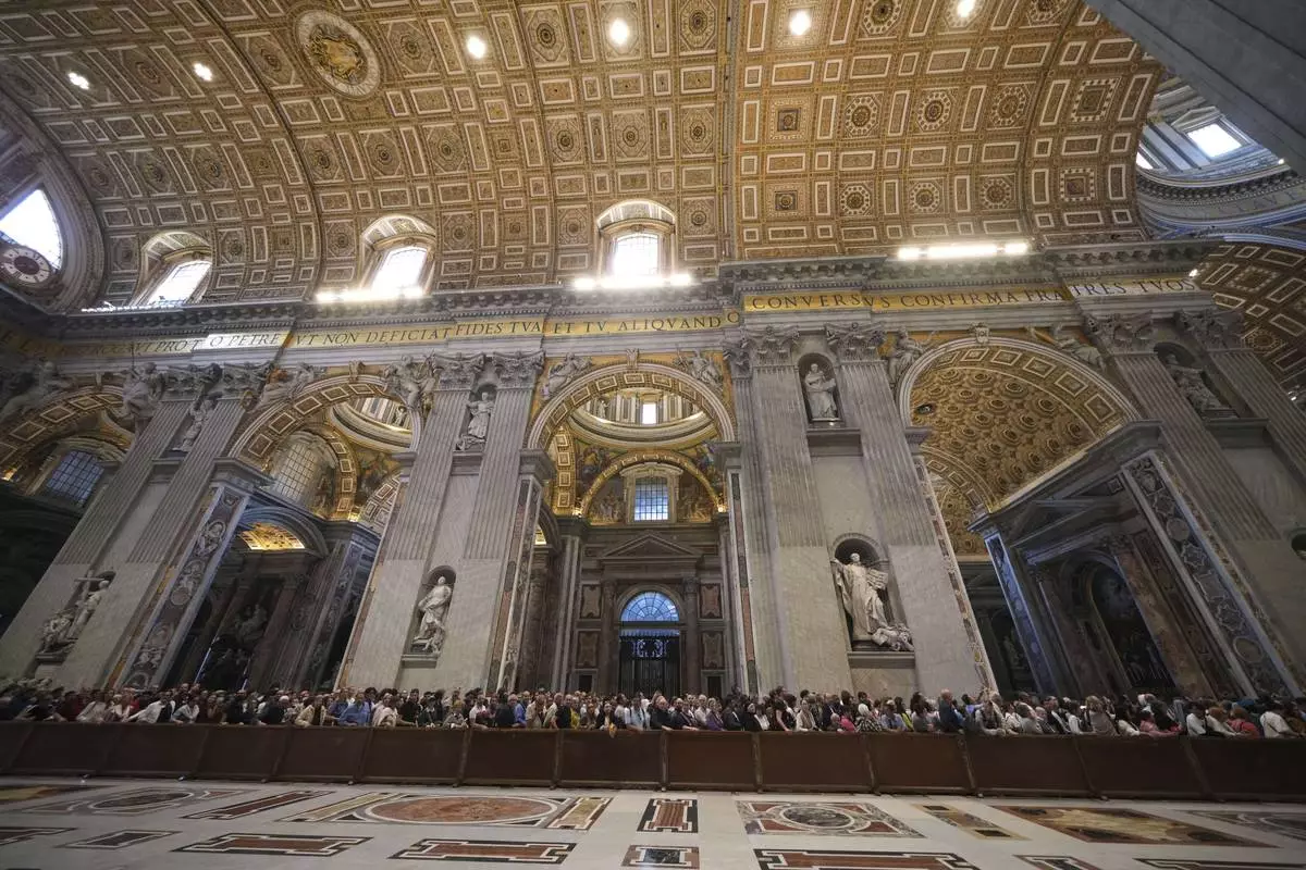 People line up to view Pope Francis lying in state inside St. Peter's Basilica, at the Vatican, Thursday, April 24, 2025. (AP Photo/Markus Schreiber)