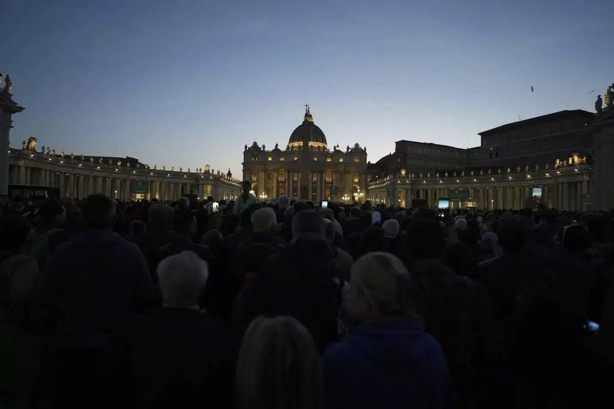 Faithful gather in St. Peter's Square at the Vatican, Wednesday, April 23, 2025 as the body of the late Pope Francis will lie in state inside St. Peter's Basilica for three days. (AP Photo/Markus Schreiber)