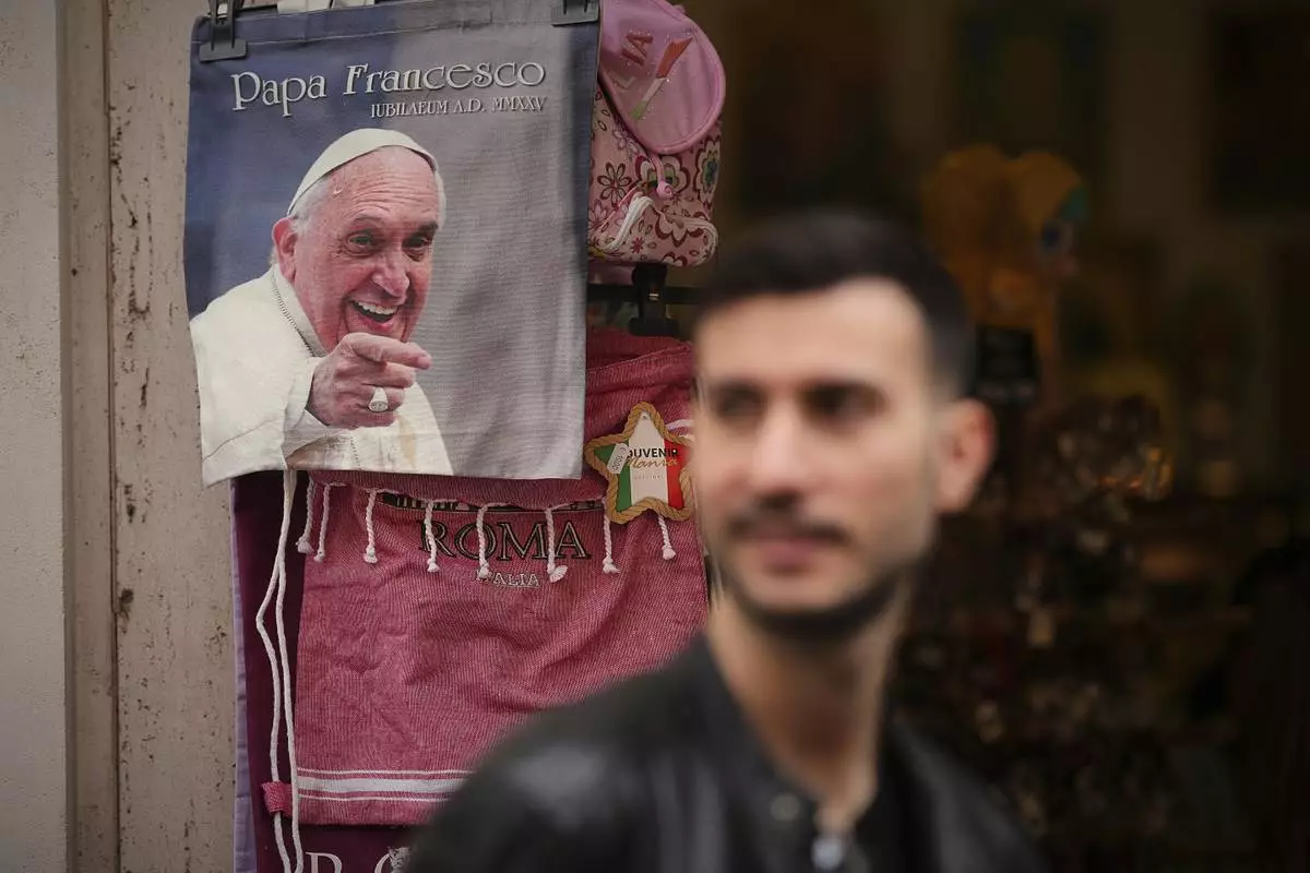 A photo of the late Pope Francis is printed on a bag on sale at a souvenir shop outside the Vatican, Thursday, April 24, 2025. (AP Photo/Andreea Alexandru)