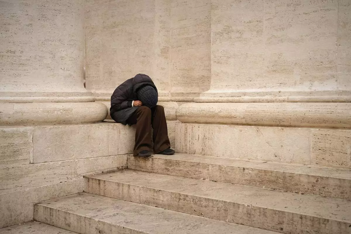 A woman sits in St. Peter's Square as people wait to pay their respects to the late Pope Francis, who will lie in state at St. Peter's Basilica for three days, at the Vatican, Wednesday, April 23, 2025. (AP Photo/Andreea Alexandru)