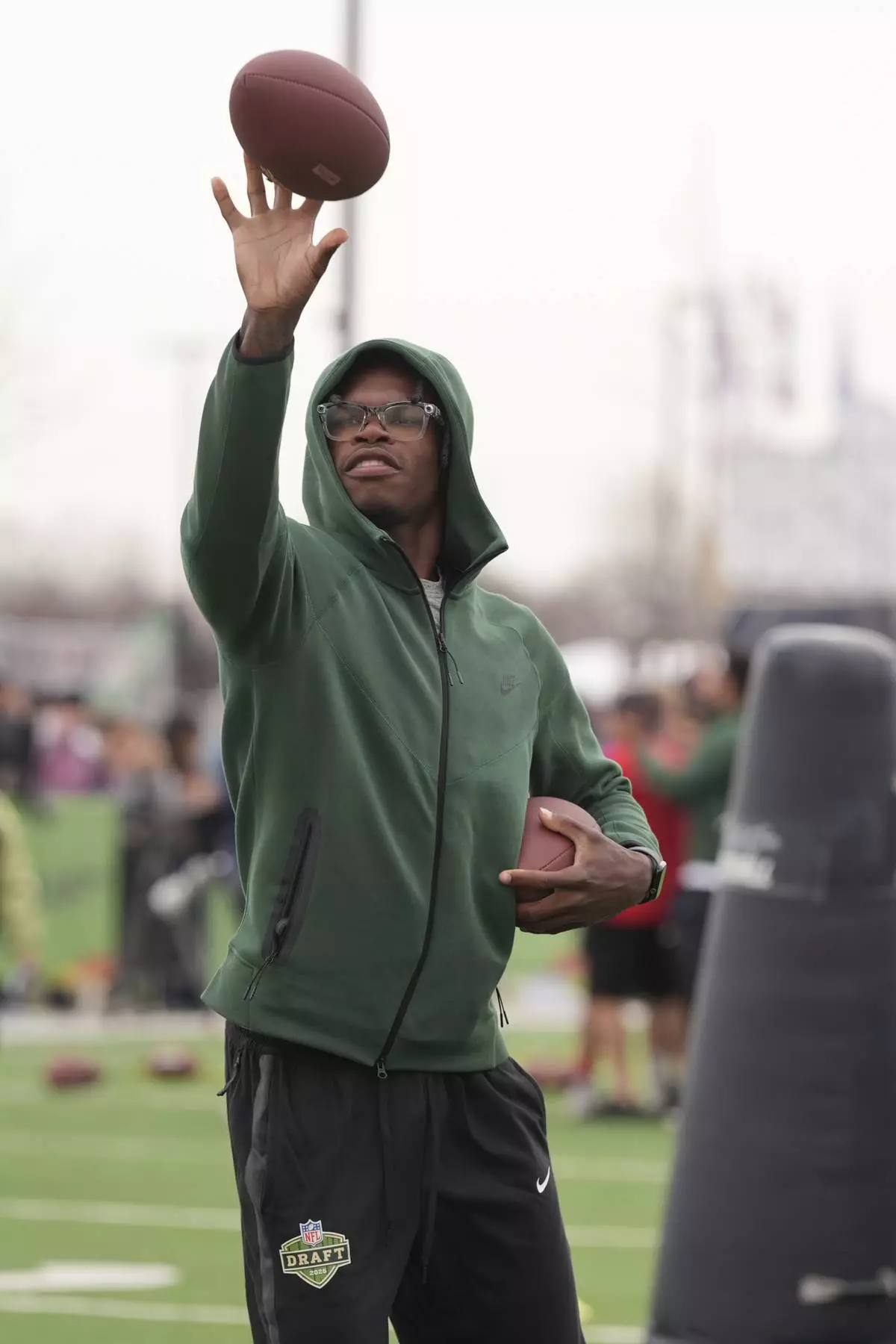 Draft prospect Travis Hunter of Colorado works with local youth football players and Special Olympics athletes during the league's annual prospect clinic ahead of the NFL football draft Wednesday, April 23, 2025, in Green Bay, Wis. (AP Photo/Jeff Roberson)