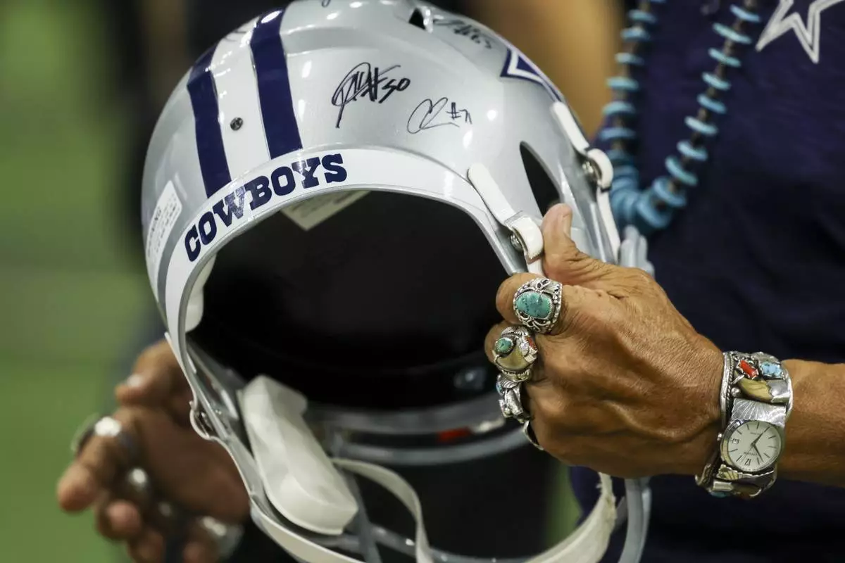 A Dallas Cowboys fan holds an autographed helmet during a Cowboys NFL football draft party in Frisco, Texas, Thursday, April 24, 2025. (AP Photo/Gareth Patterson)