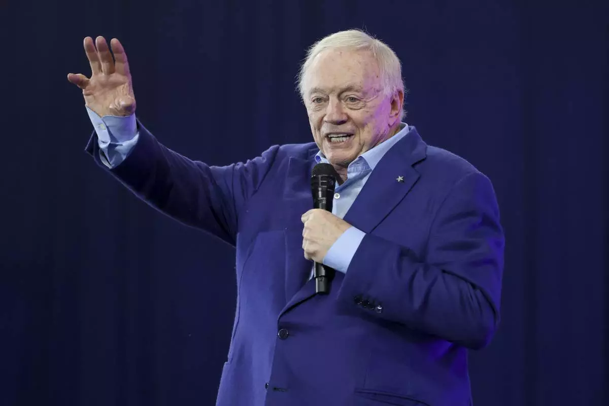 Dallas Cowboys owner Jerry Jones speaks during an NFL football draft party in Frisco, Texas, Thursday, April 24, 2025. (AP Photo/Gareth Patterson)