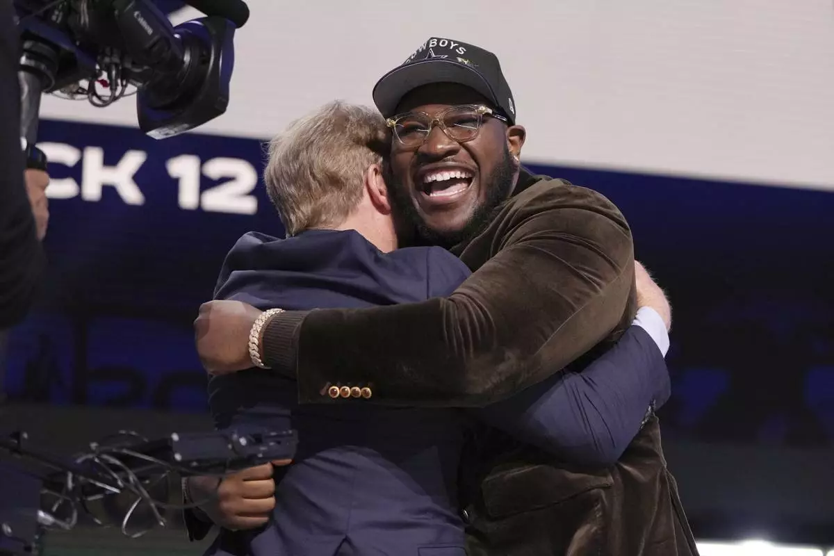 Alabama offensive lineman Tyler Booker, right, celebrates with NFL Commissioner Roger Goodell after being chosen by the Dallas Cowboys with the 12th overall pick during the first round of the NFL football draft, Thursday, April 24, 2025, in Green Bay, Wis. (AP Photo/Jeff Roberson)