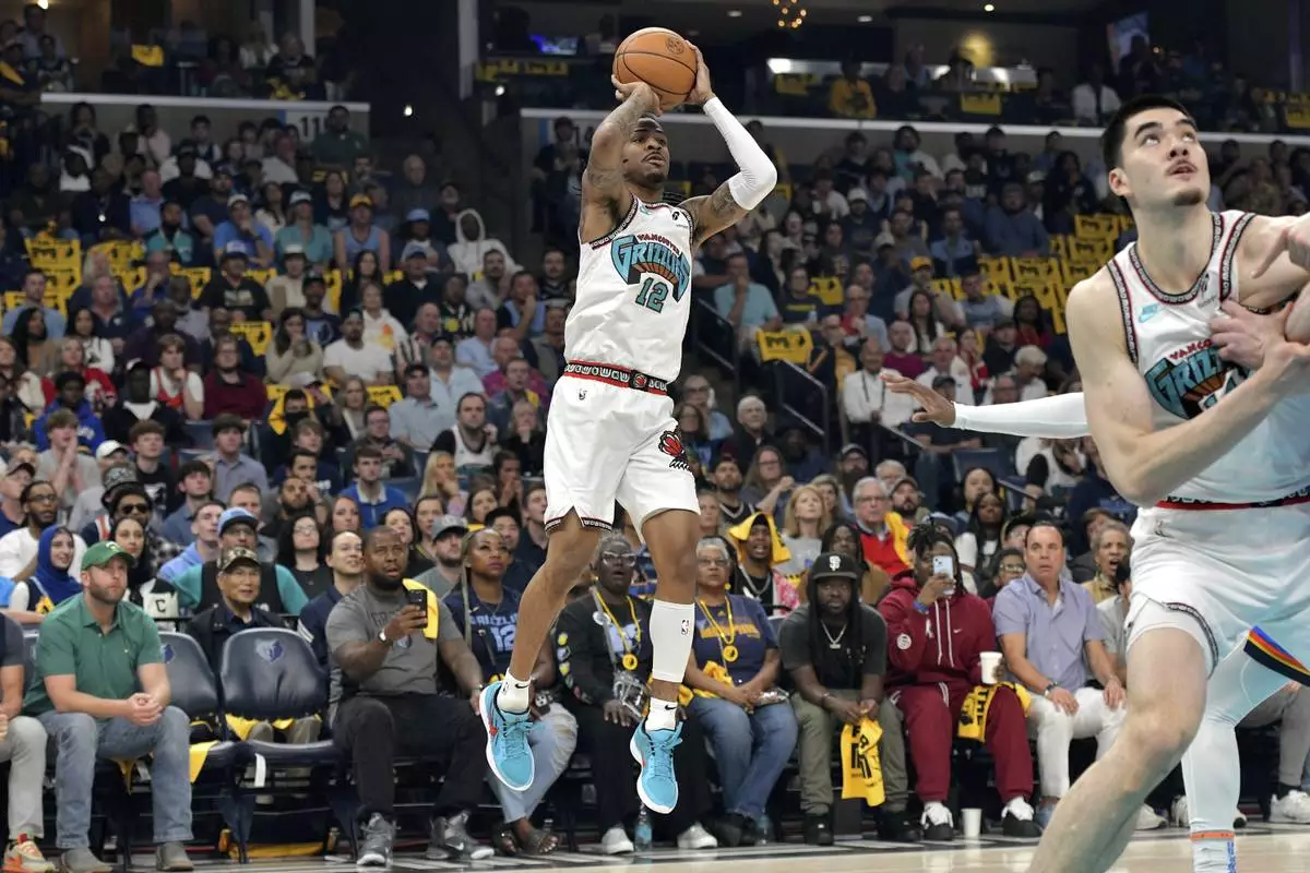 Memphis Grizzlies guard Ja Morant (12) shoots against the Oklahoma City Thunder in the first half of Game 3 of an NBA first-round playoff series Thursday, April 24, 2025, in Memphis, Tenn. (AP Photo/Brandon Dill)