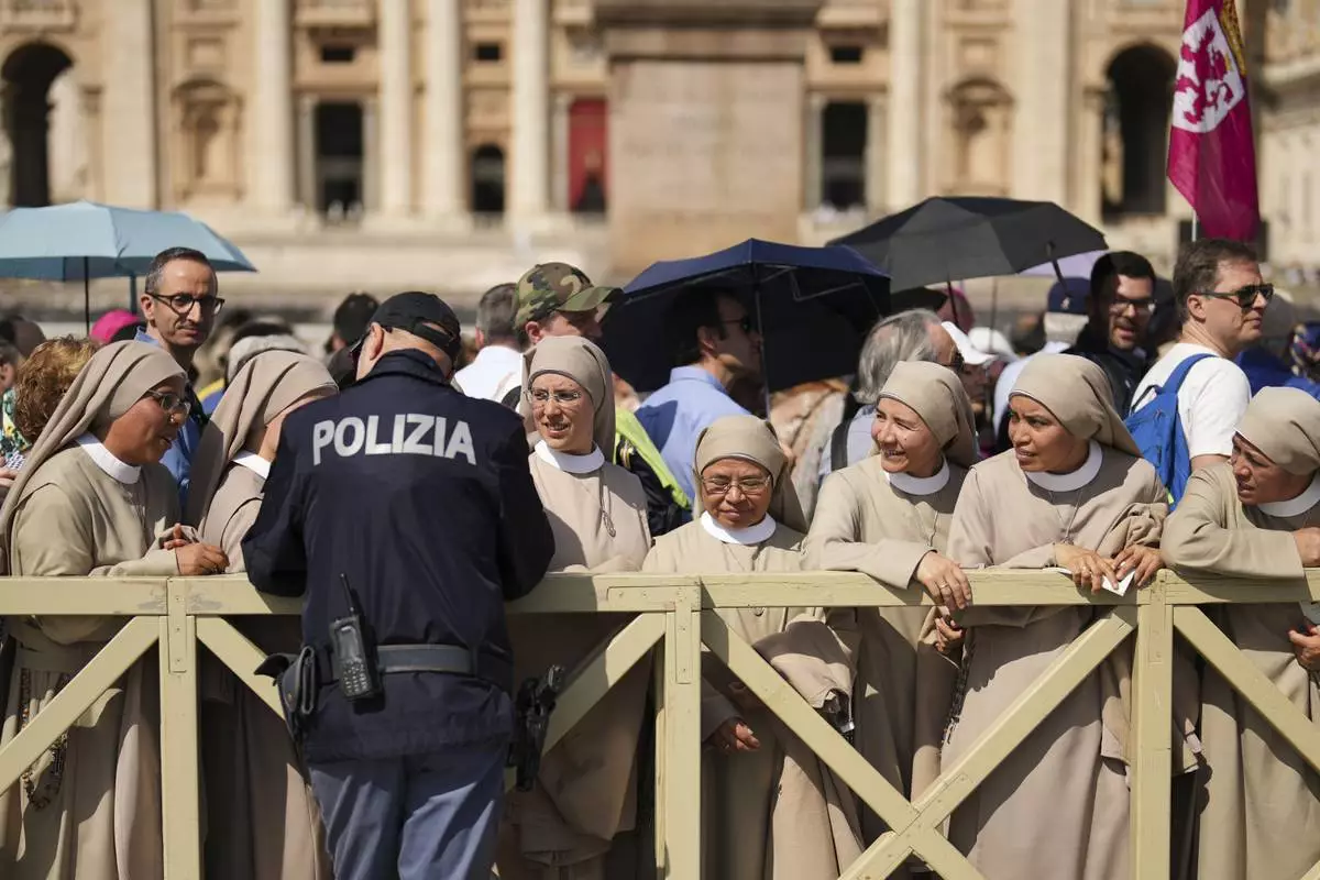 Nuns arriving from Spain, some from South America, chat with a policeman while waiting in line to see the body of Pope Francis, who will lie in state for three days, in St. Peter's Basilica at the Vatican, Wednesday, April 23, 2025. (AP Photo/Francisco Seco)