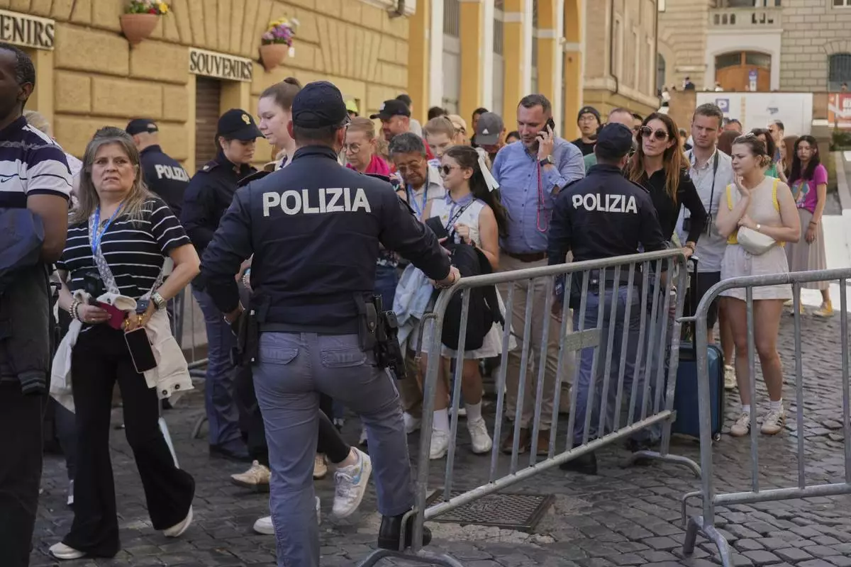 A policeman stands next to people waiting to enter St. Peter's Square to pay their respects to the late Pope Francis, lying in state at St. Peter's Basilica for the final day, at the Vatican, Friday, April 25, 2025. (AP Photo/Andreea Alexandru)