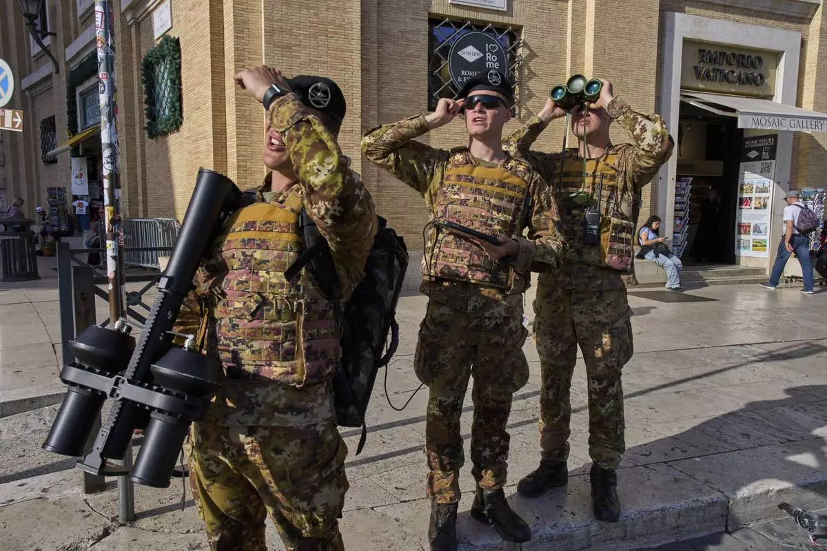 Italian army soldiers carrying an anti drone gun patrol the area in front of St. Peter's Square before a rosary prayer for the late Pope Francis, in Rome Tuesday, April 22, 2025. (AP Photo/Bernat Armangue)