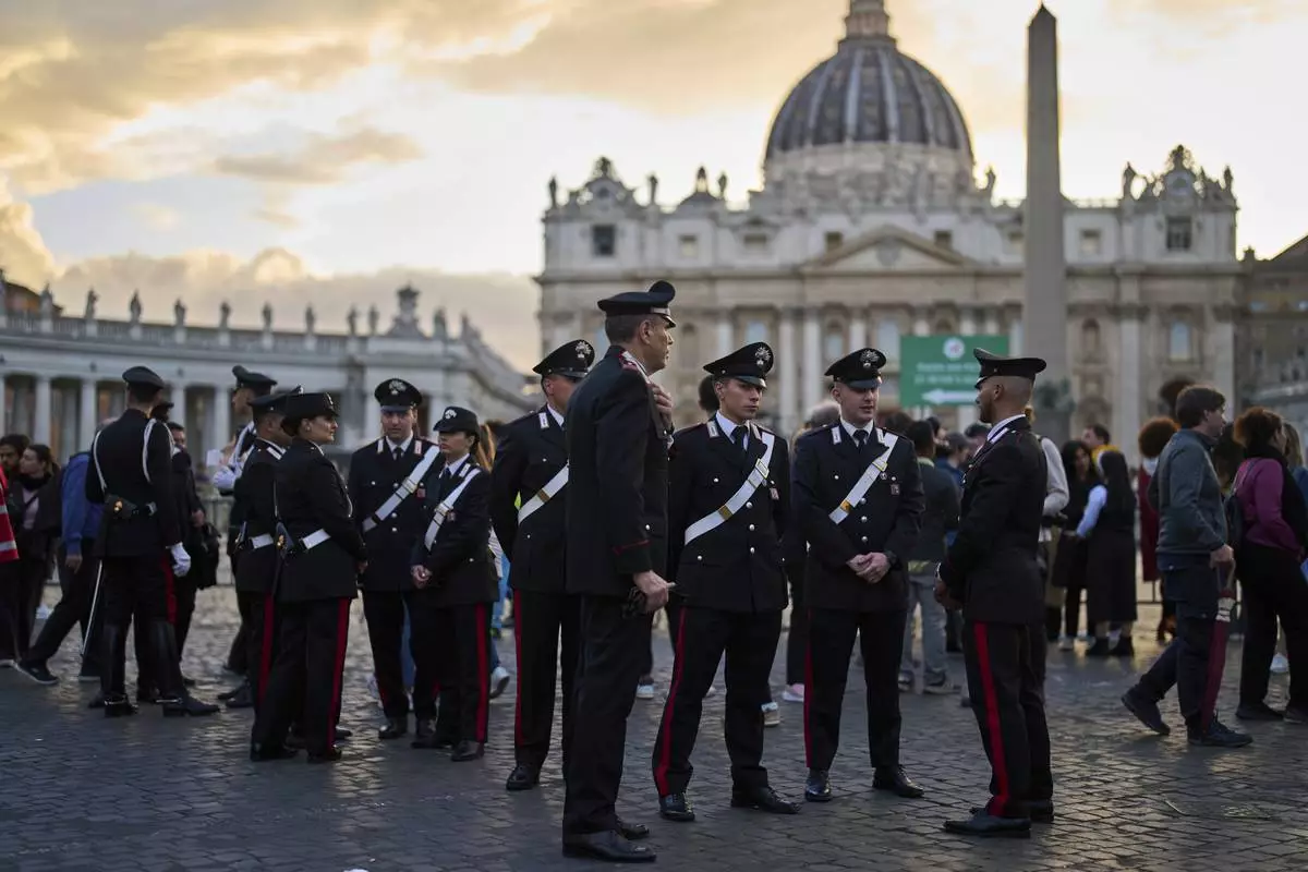 Italian Carabinieri paramilitary police stand beneath the Bernini Colonnade near St.Peter's Basilica where Pope Francis is lying in state, at the Vatican, Thursday, April 24, 2025. (AP Photo/Francisco Seco)
