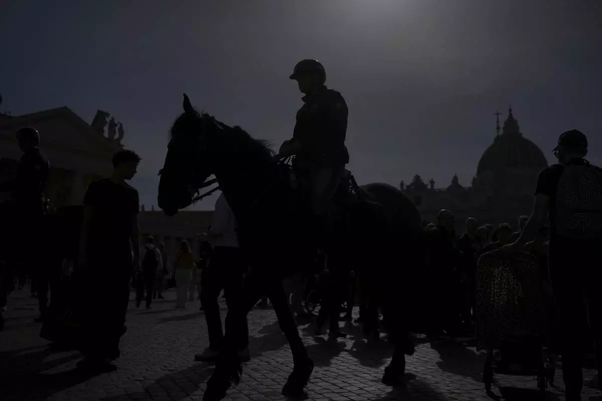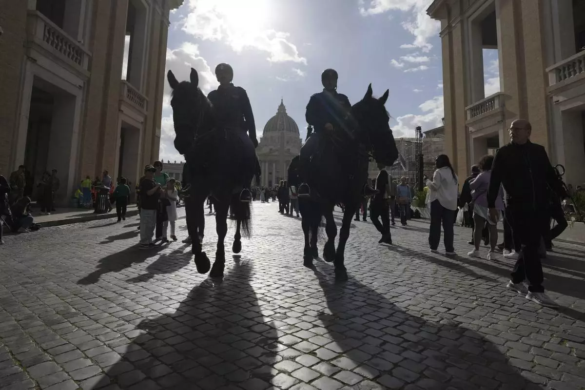 Horse mounted police patrol the area next to St. Peter's Square at the Vatican, Thursday April 24, 2025. (AP Photo/Markus Schreiber)