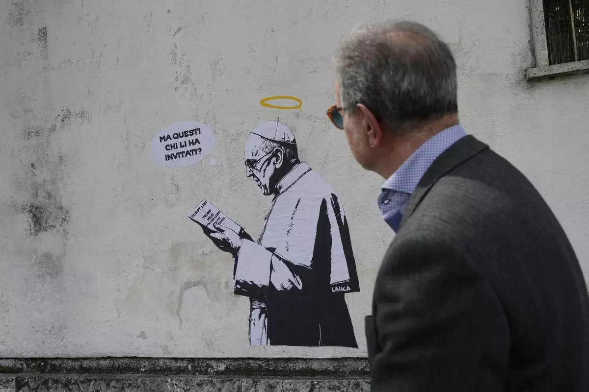 A man walks past a graffiti by artist Laika depicting Pope Francis holding a list of guests for his funeral and reading in Italian "Who invited them?" in Rome, Friday April 25, 2025. (AP Photo/Luca Bruno)