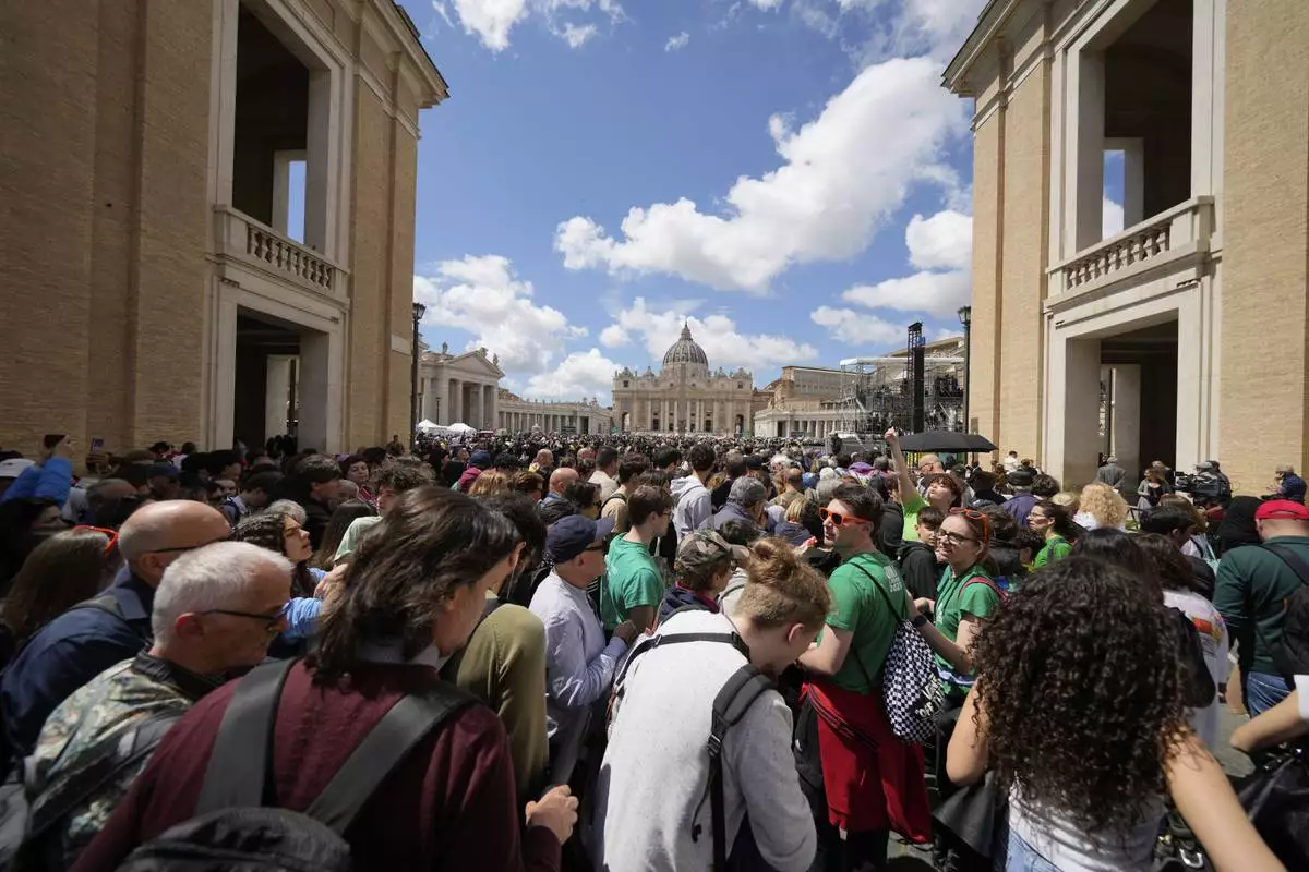 People line up to enter St. Peter's Square at the Vatican, Friday April 25, 2025. (AP Photo/Luca Bruno)