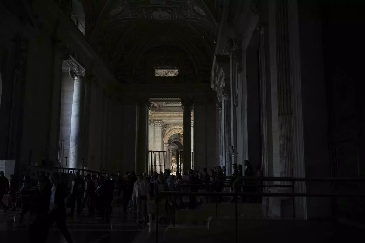 People wait in line to enter St. Peter's Basilica where Pope Francis is lying in state, at the Vatican, Friday, April 25, 2025. (AP Photo/Bernat Armangue)