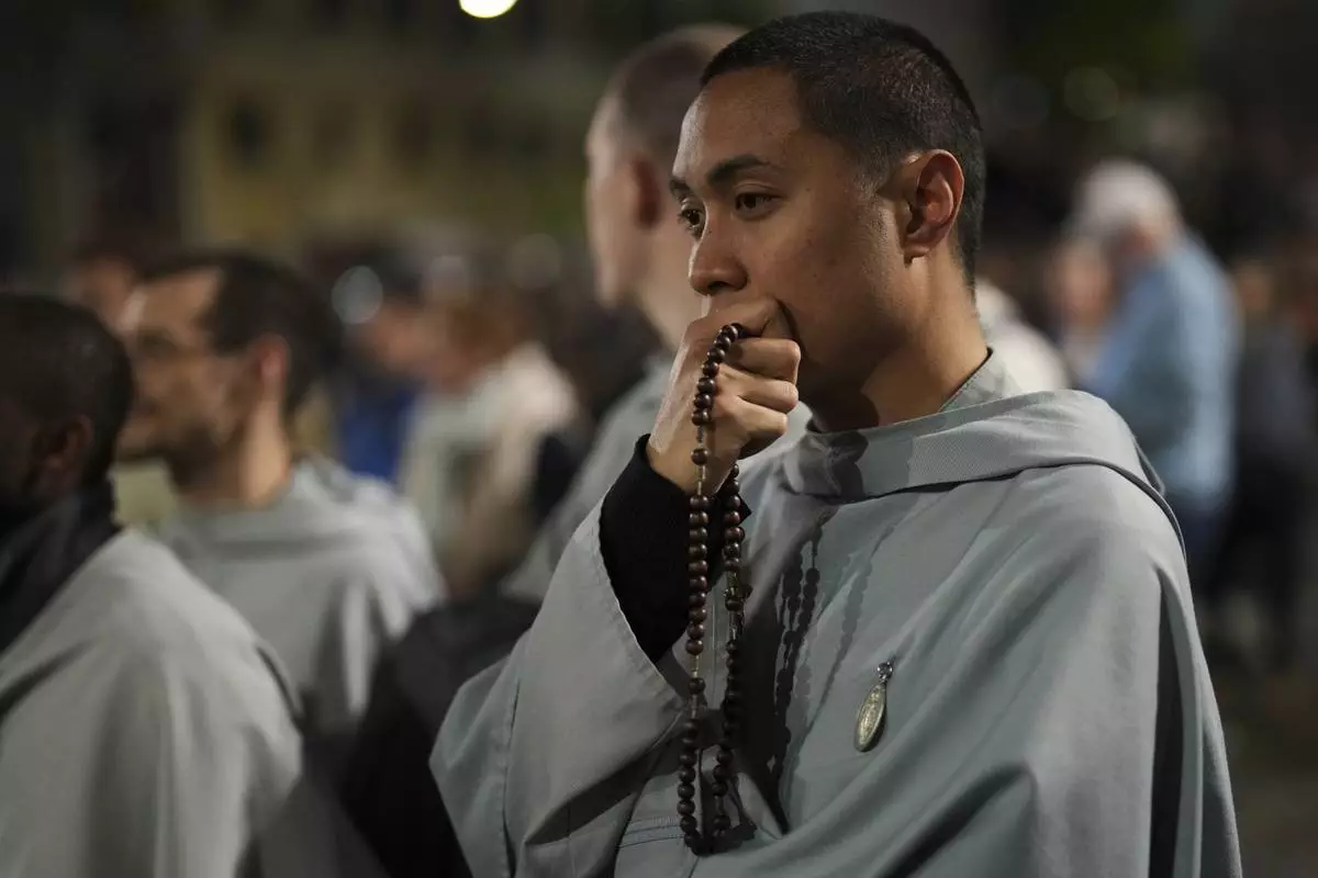 Priests and faithful pray the rosary outside St. Mary Major Basilica, in Rome, Friday, April 25, 2025 (AP Photo/Francisco Seco)