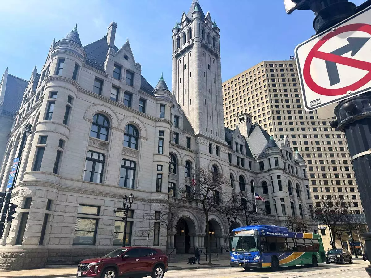Traffic passes the Federal courthouse in Milwaukee on Friday, April 25, 2025. (AP Photo/Devi Shastri)