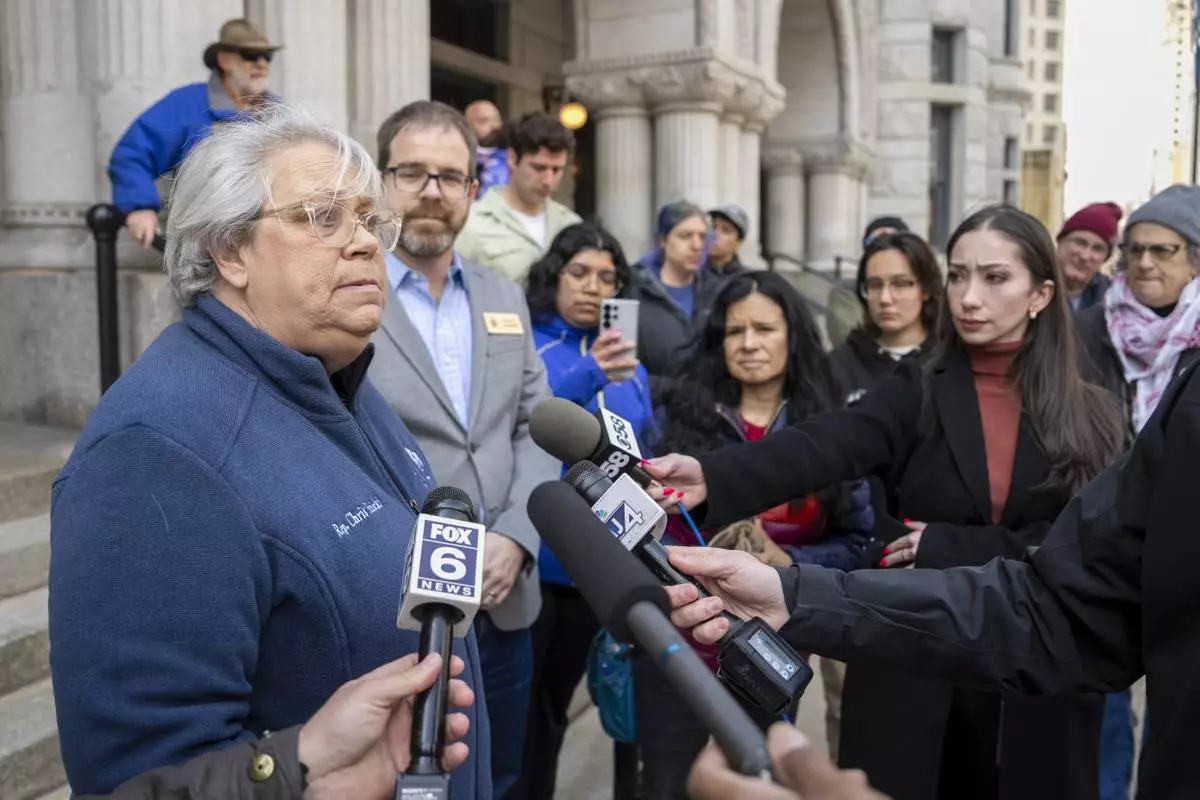 Rep. Christine Sinicki, D-Milwaukee, addresses the media outside of the federal courthouse Friday, April 25, 2025, in Milwaukee after county Judge Hannah Dugan was arrested. (AP Photo/Andy Manis)