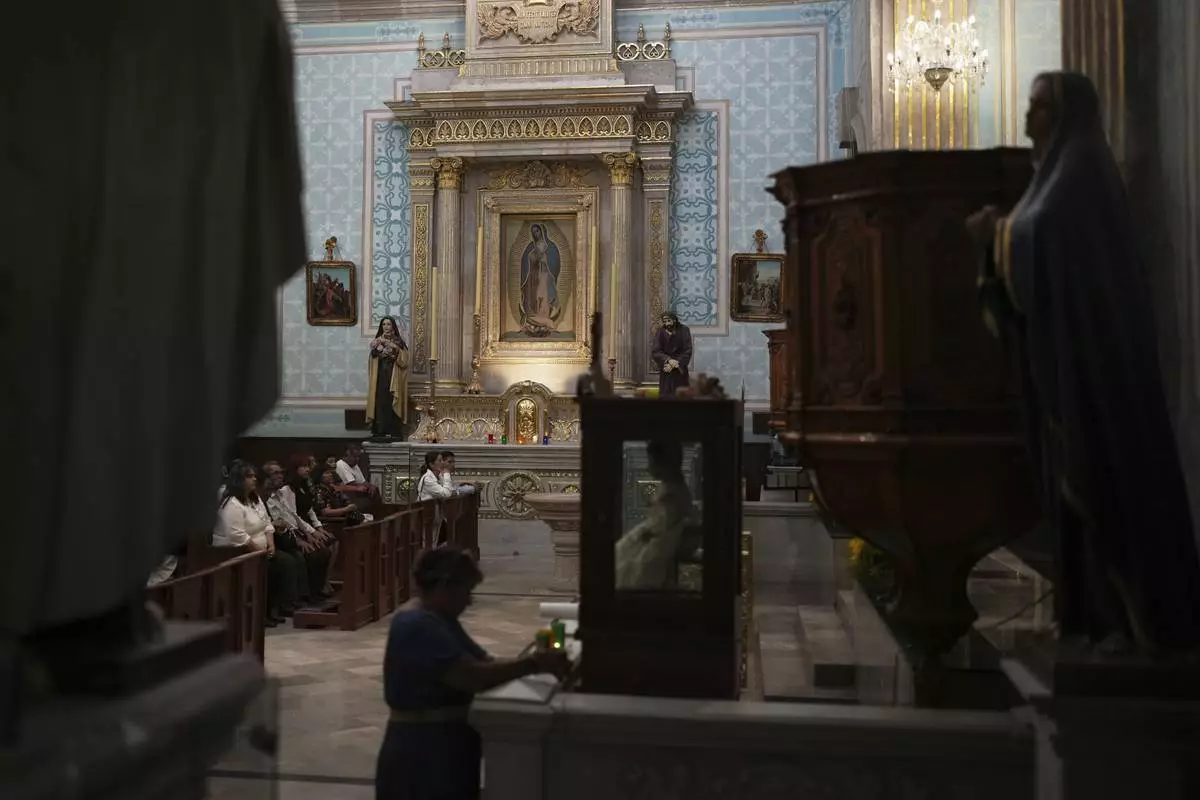 Devotees sit inside St. Mark's church, near an altar dedicated to the Virgin of Guadalupe, during St. Mark’s Fair, a month-long event honoring the saint, in Aguascalientes, Mexico, Friday, April 25, 2025. (AP Photo/Eduardo Verdugo)