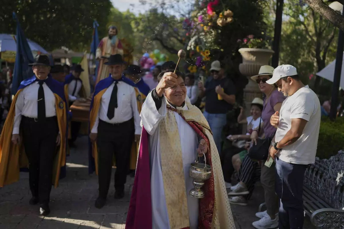 A priest sprinkles "holy water" on parishioners during St. Mark's Fair, a month-long event honoring the saint, outside St. Mark's Church in Aguascalientes, Mexico, Friday, April 25, 2025. (AP Photo/Eduardo Verdugo)