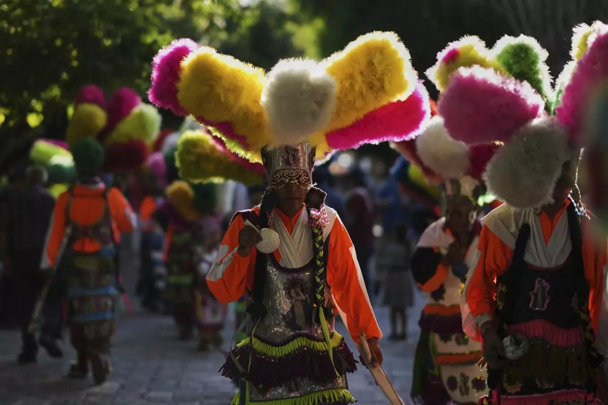 Parishioners dance during St. Mark's Fair, a month-long event honoring the saint, outside St. Mark's church in Aguascalientes, Mexico, Friday, April 25, 2025. (AP Photo/Eduardo Verdugo)