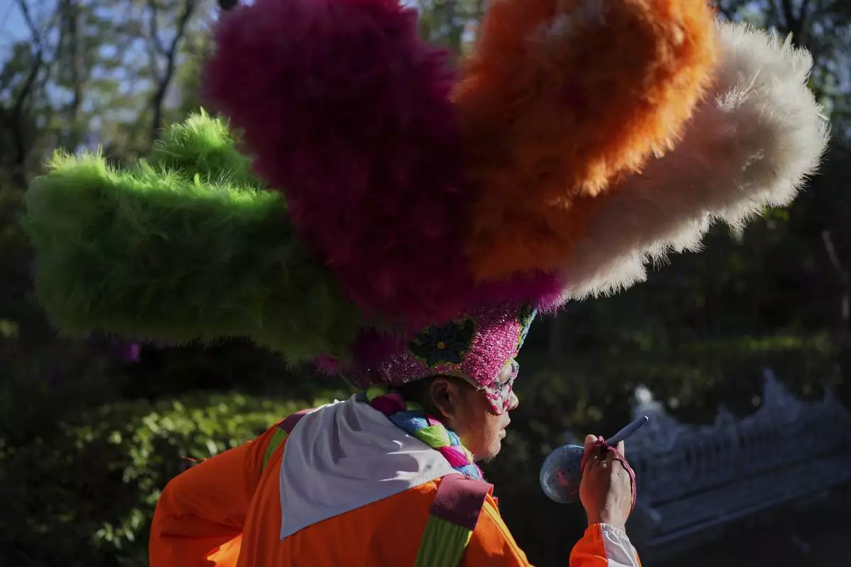 A parishioner dances during St. Mark's Fair, a month-long event honoring the saint, outside St. Mark's church in Aguascalientes, Mexico, Friday, April 25, 2025. (AP Photo/Eduardo Verdugo)