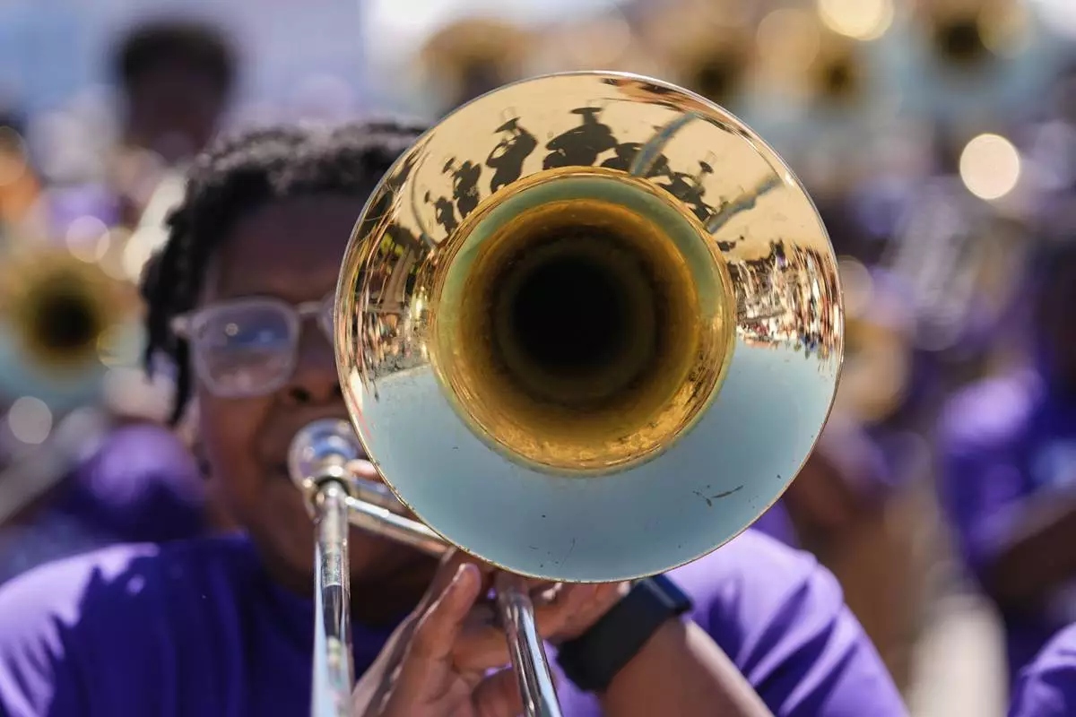 The band is reflected in a trombone as the Roots of Music Marching Crusaders parade through the New Orleans Jazz & Heritage Festival in New Orleans, Sunday, May 4, 2025. (AP Photo/Gerald Herbert)