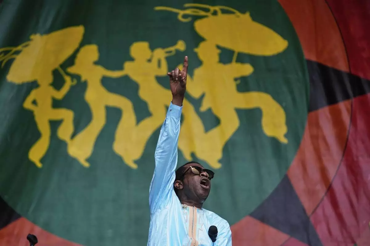 Youssou N'Dour performs during the first weekend of the New Orleans Jazz & Heritage Festival on Friday, April 25, 2025, at Fair Grounds Race Course in New Orleans. (Photo by Amy Harris/Invision/AP)