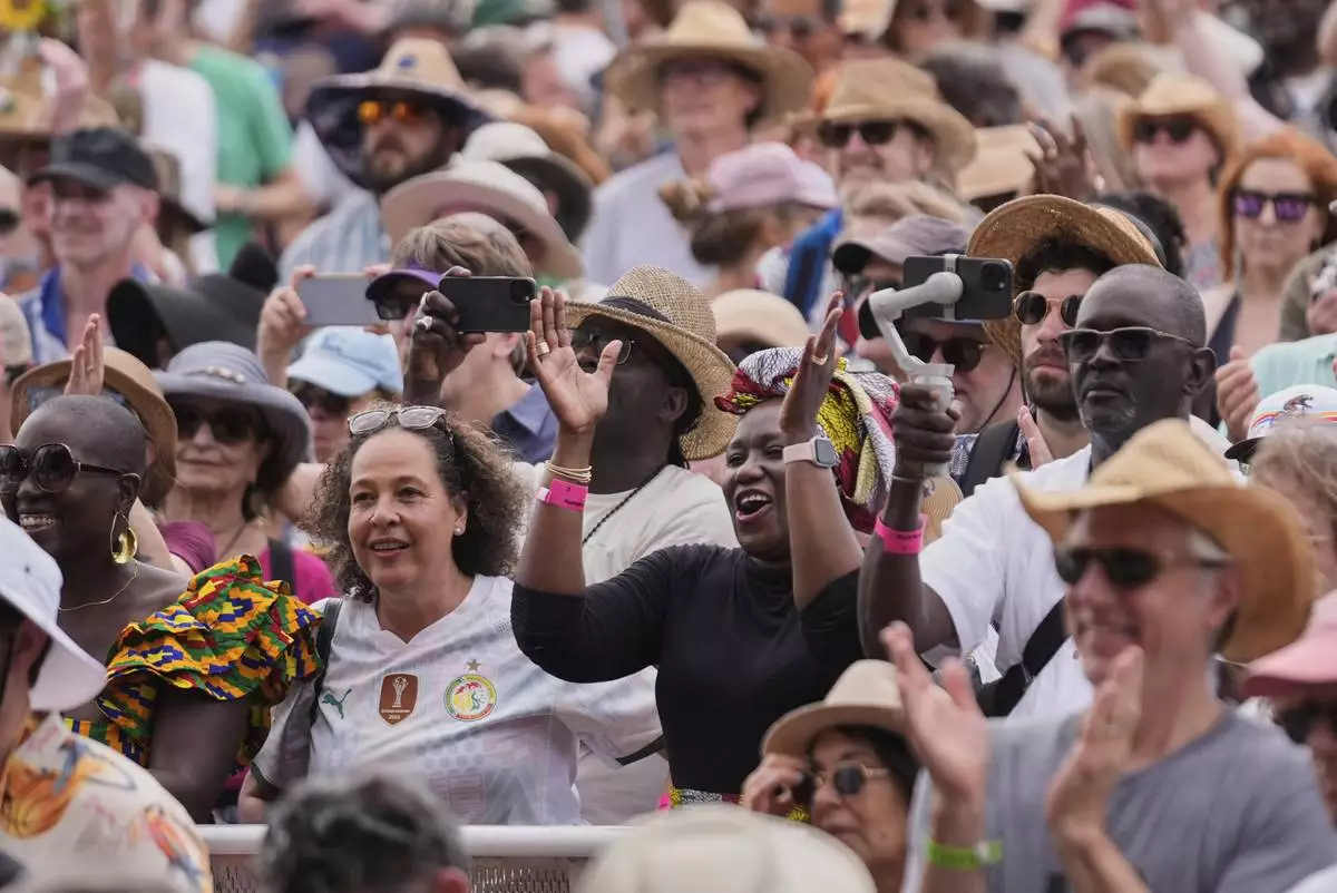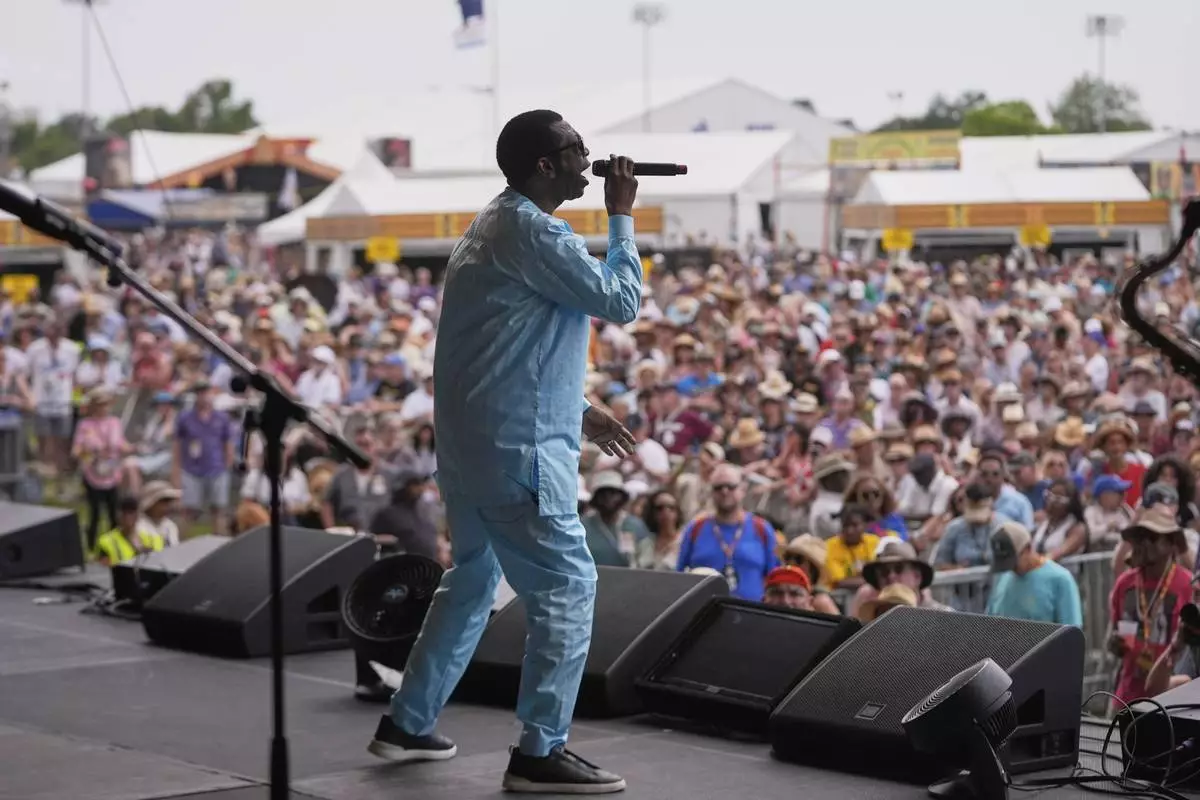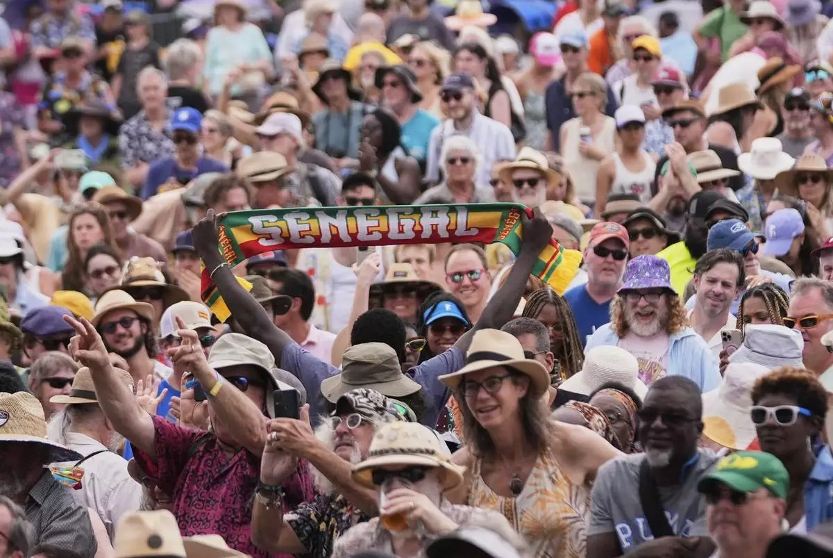 The crowd reacts as Youssou N'Dour performs at the New Orleans Jazz & Heritage Festival in New Orleans, Friday, April 25, 2025. (AP Photo/Gerald Herbert)