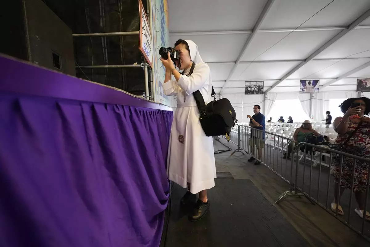 Sister Boram Lee, a Catholic nun with the Salesian Sisters, stands on a pedestal while photographing the Academy Of Our Lady High School gospel choir at the New Orleans Jazz & Heritage Festival in New Orleans, Friday, April 25, 2025. (AP Photo/Gerald Herbert)