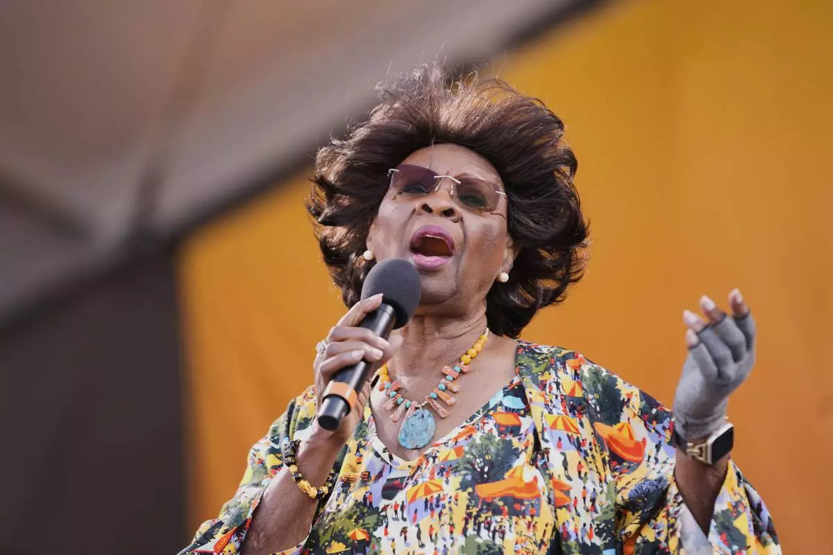 Irma Thomas performs with the band Galactic at the New Orleans Jazz & Heritage Festival in New Orleans, Sunday, May 4, 2025. (AP Photo/Gerald Herbert)