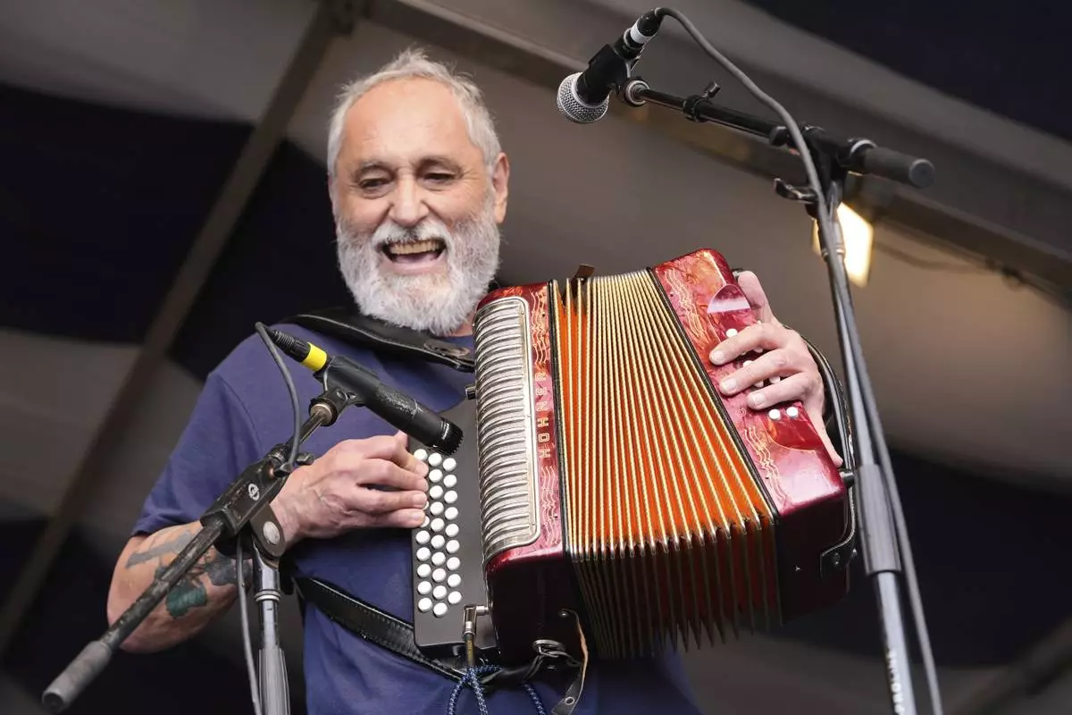 Aaron Wilkinson of The Honey Island Swamp Band performs with the band at the New Orleans Jazz & Heritage Festival in New Orleans, Friday, April 25, 2025. (AP Photo/Gerald Herbert)