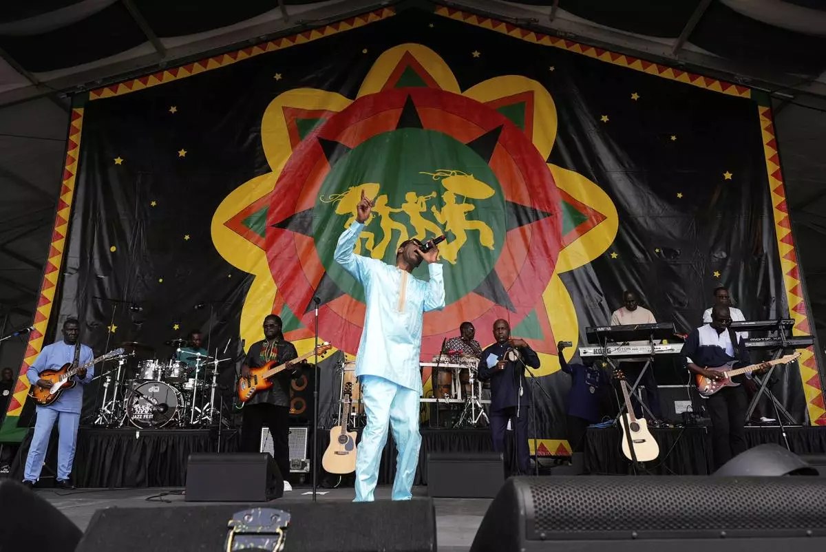 Youssou N'Dour performs at the New Orleans Jazz & Heritage Festival in New Orleans, Friday, April 25, 2025. (AP Photo/Gerald Herbert)