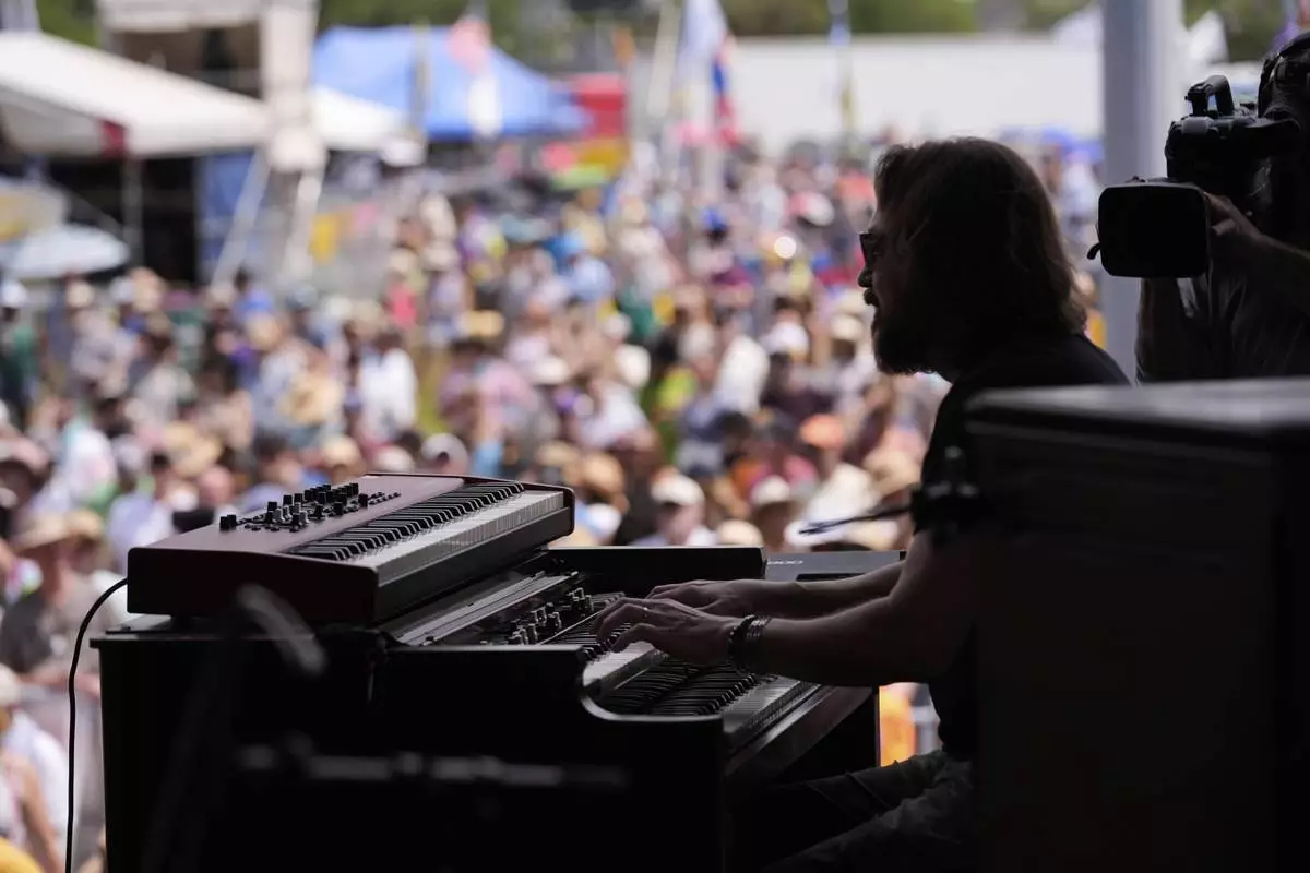 Sam Price of The Honey Island Swamp Band performs during the first weekend of the New Orleans Jazz & Heritage Festival on Friday, April 25, 2025, at Fair Grounds Race Course in New Orleans. (Photo by Amy Harris/Invision/AP)