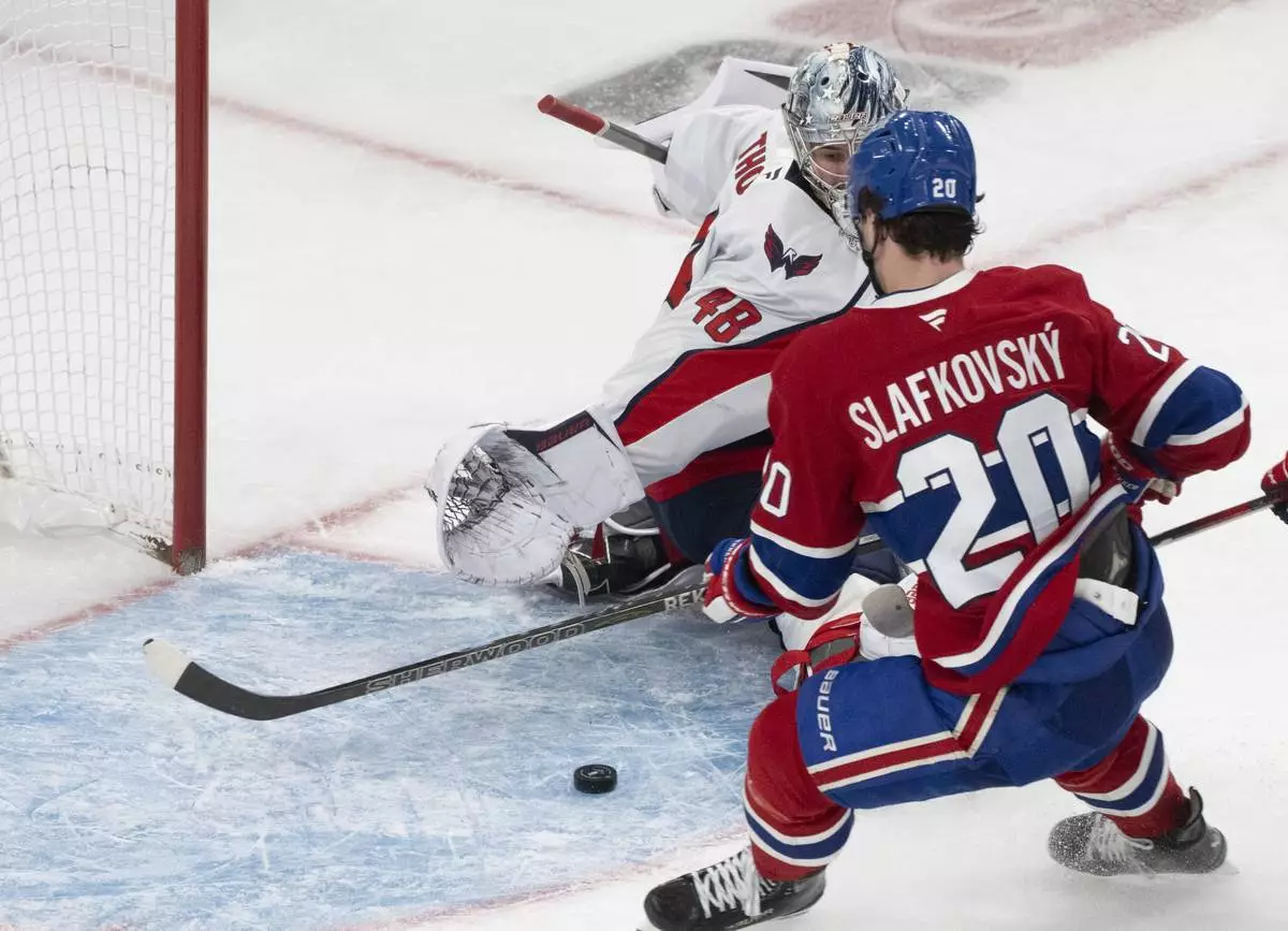 Montreal Canadiens' Juraj Slafkovsky (20) scores against Washington Capitals goaltender Logan Thompson (48) during the third period of Game 3 of a first-round NHL hockey playoff series in Montreal, Friday, April 25, 2025. (Christinne Muschi/The Canadian Press via AP)