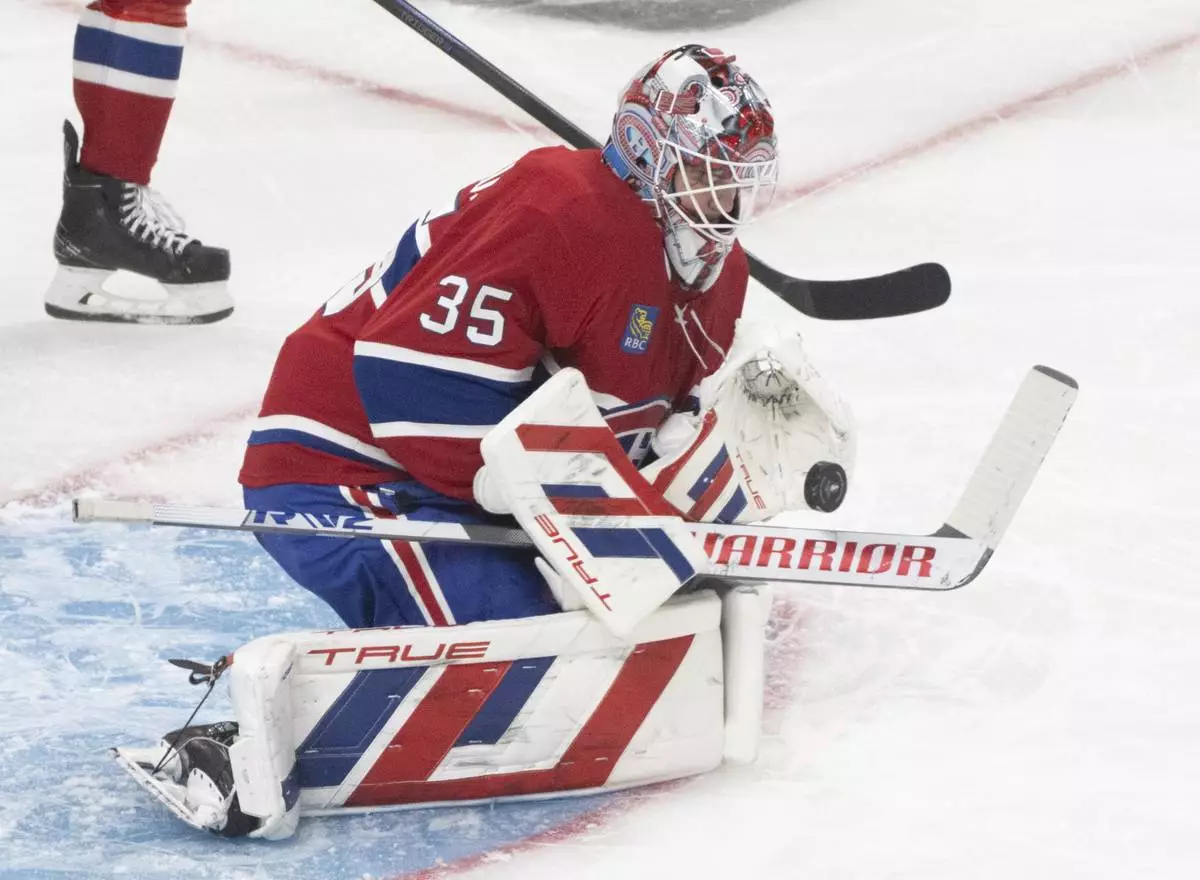 Montreal Canadiens goaltender Sam Montembeault (35) makes a save during the second period of Game 3 of a first-round NHL hockey playoff series against the Washington Capitals in Montreal, Friday, April 25, 2025. (Christinne Muschi/The Canadian Press via AP)