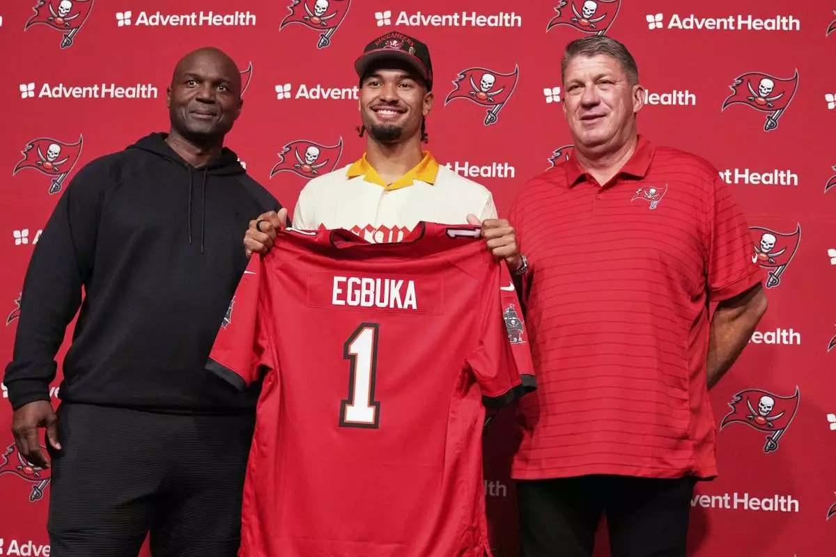Tampa Bay Buccaneers first round draft pick Emeka Egbuka holds up a jersey as he poses with head coach Todd Bowles, left, and general manager Jason Licht, right during an NFL football news conference Friday, April 25, 2025, in Tampa, Fla. (AP Photo/Chris O'Meara)