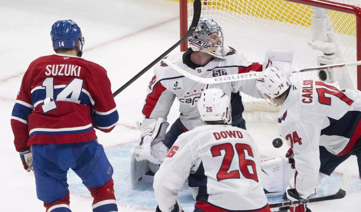 Montreal Canadiens' Nick Suzuki (14) scores against Washington Capitals goaltender Logan Thompson, center top, during the second period of Game 3 of a first-round NHL hockey playoff series in Montreal, Friday, April 25, 2025. (Christinne Muschi/The Canadian Press via AP)