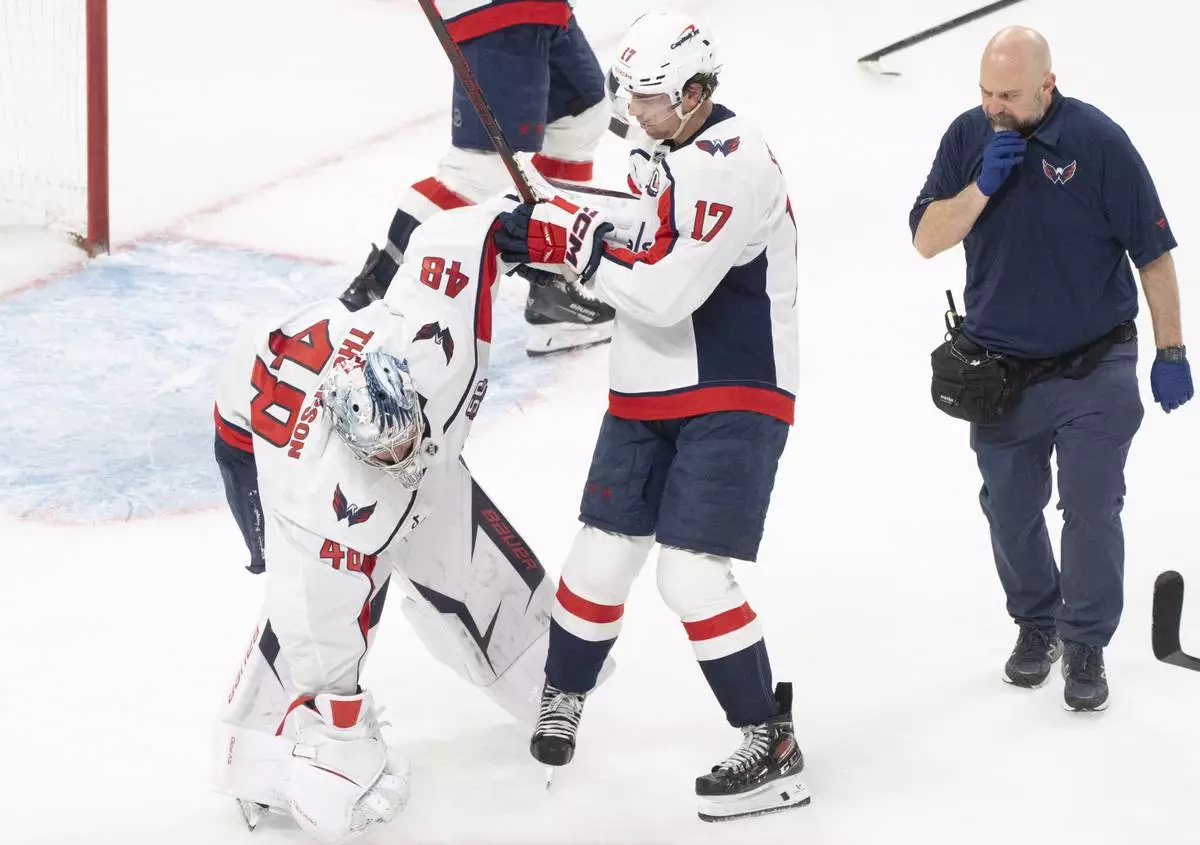 Washington Capitals goaltender Logan Thompson (48) stumbles as he is helped off the ice by teammate Dylan Strome (17) during the third period of Game 3 of a first-round NHL hockey playoff series against the Montreal Canadiens in Montreal, Friday, April 25, 2025. (Christinne Muschi/The Canadian Press via AP