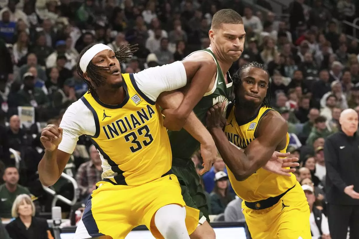 Milwaukee Bucks center Brook Lopez, center, battles for a rebound against Indiana Pacers center Myles Turner, left, and forward Aaron Nesmith during the first half in Game 3 of an NBA basketball first-round playoff series Friday, April 25, 2025, in Milwaukee. (AP Photo/Nam Y. Huh)