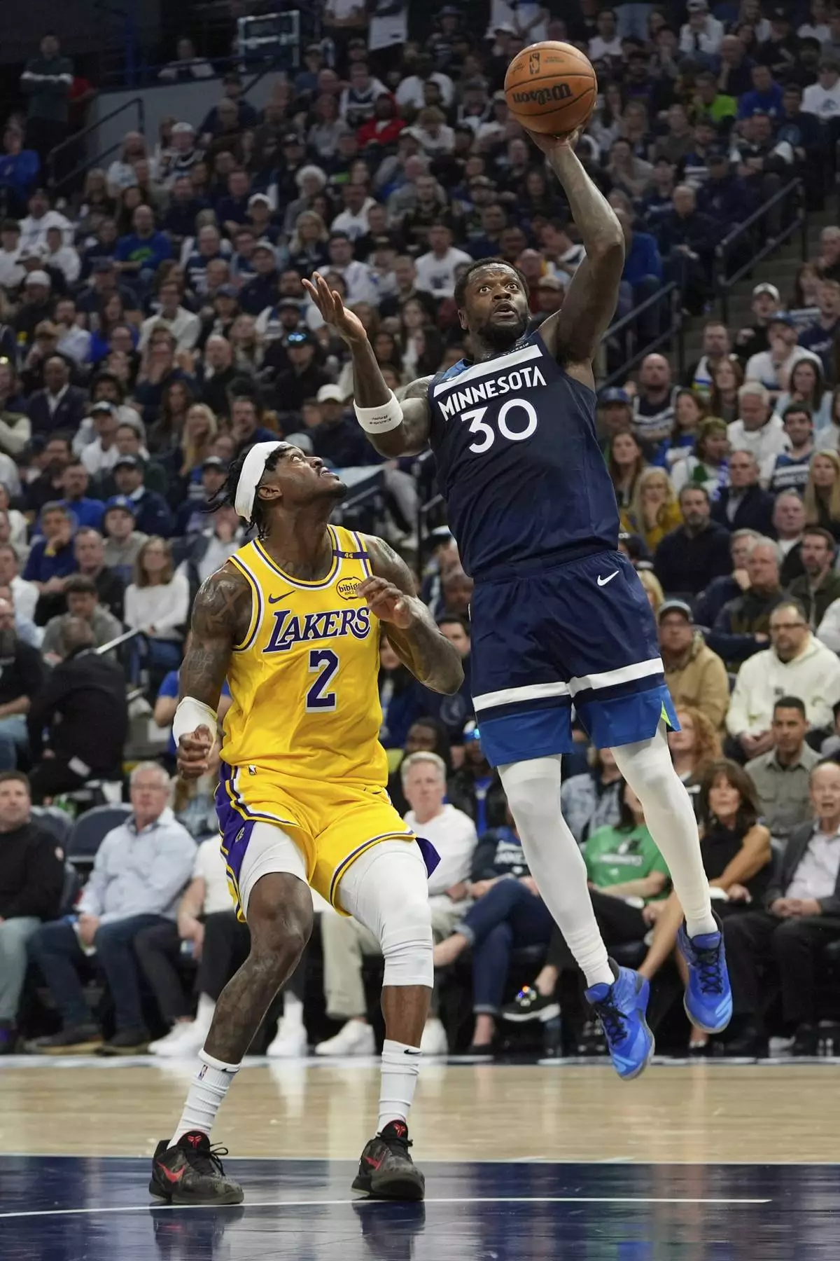 Minnesota Timberwolves forward Julius Randle (30) goes up for a shot as Los Angeles Lakers forward Jarred Vanderbilt (2) defends during the first half of Game 3 of an NBA basketball first-round playoff series, Friday, April 25, 2025, in Minneapolis. (AP Photo/Abbie Parr)