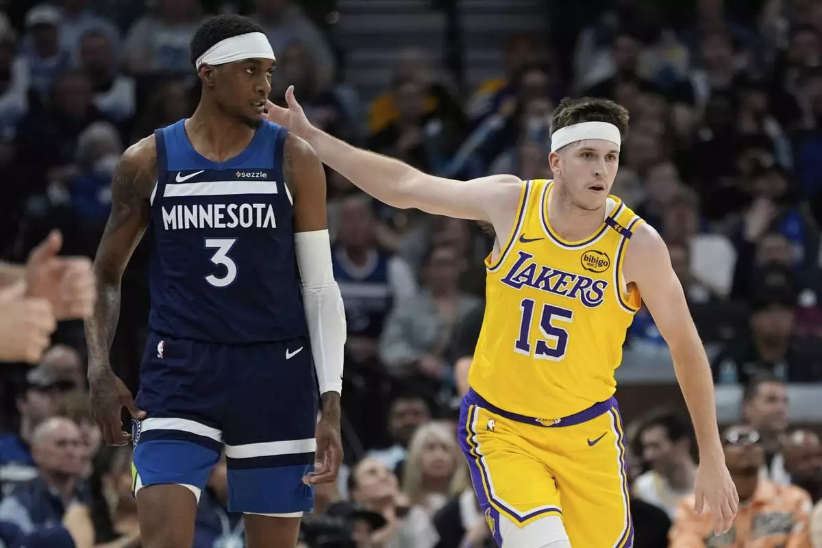 Los Angeles Lakers guard Austin Reaves (15) gestures next to Minnesota Timberwolves forward Jaden McDaniels (3) after making a 3-point basket during the first half of Game 3 of an NBA basketball first-round playoff series, Friday, April 25, 2025, in Minneapolis. (AP Photo/Abbie Parr)