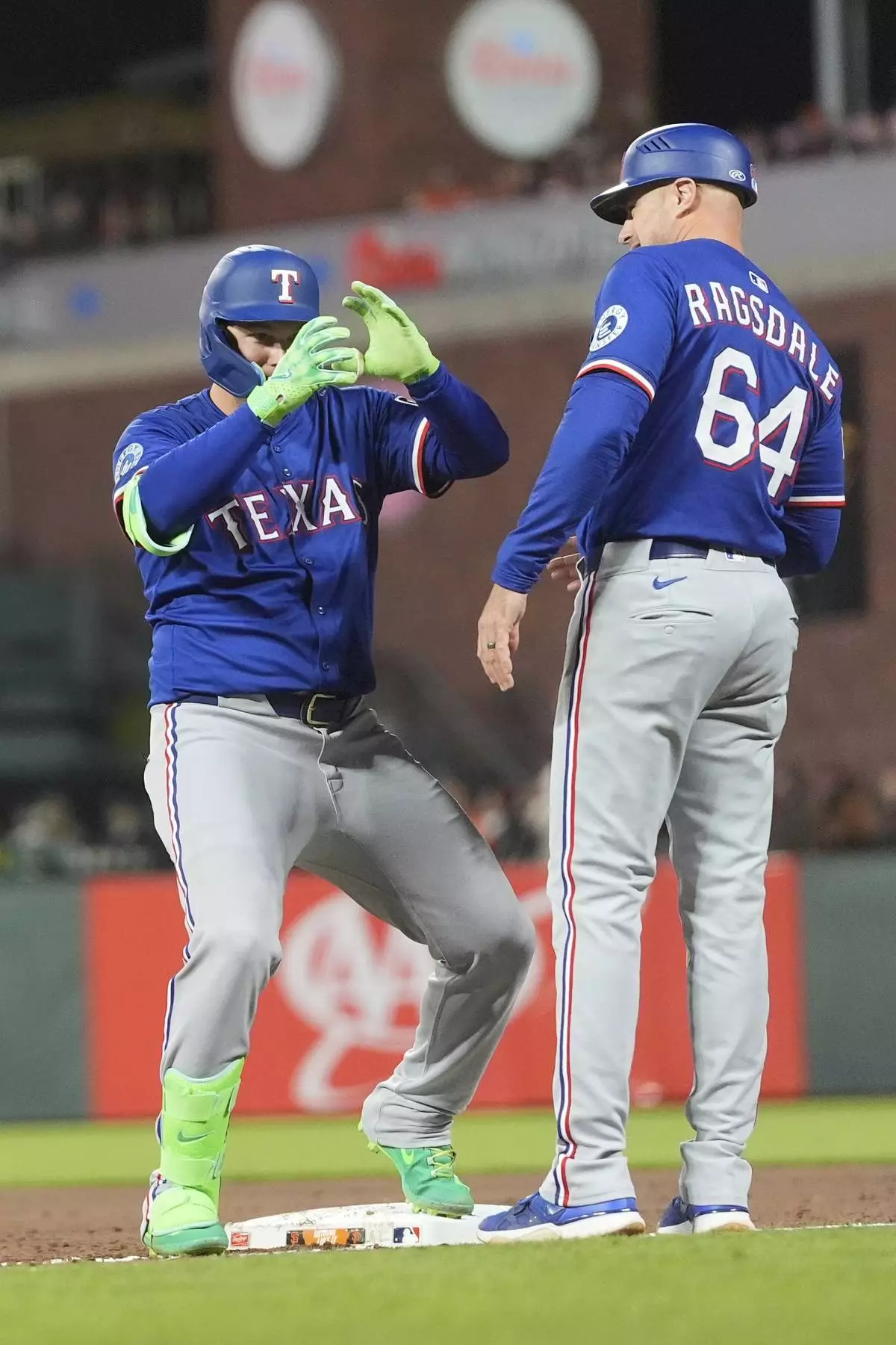 Texas Rangers' Joc Pederson, left, gestures next to first base coach Corey Ragsdale (64) after an RBI single against the San Francisco Giants during the sixth inning of a baseball game in San Francisco, Friday, April 25, 2025. (AP Photo/Jeff Chiu)