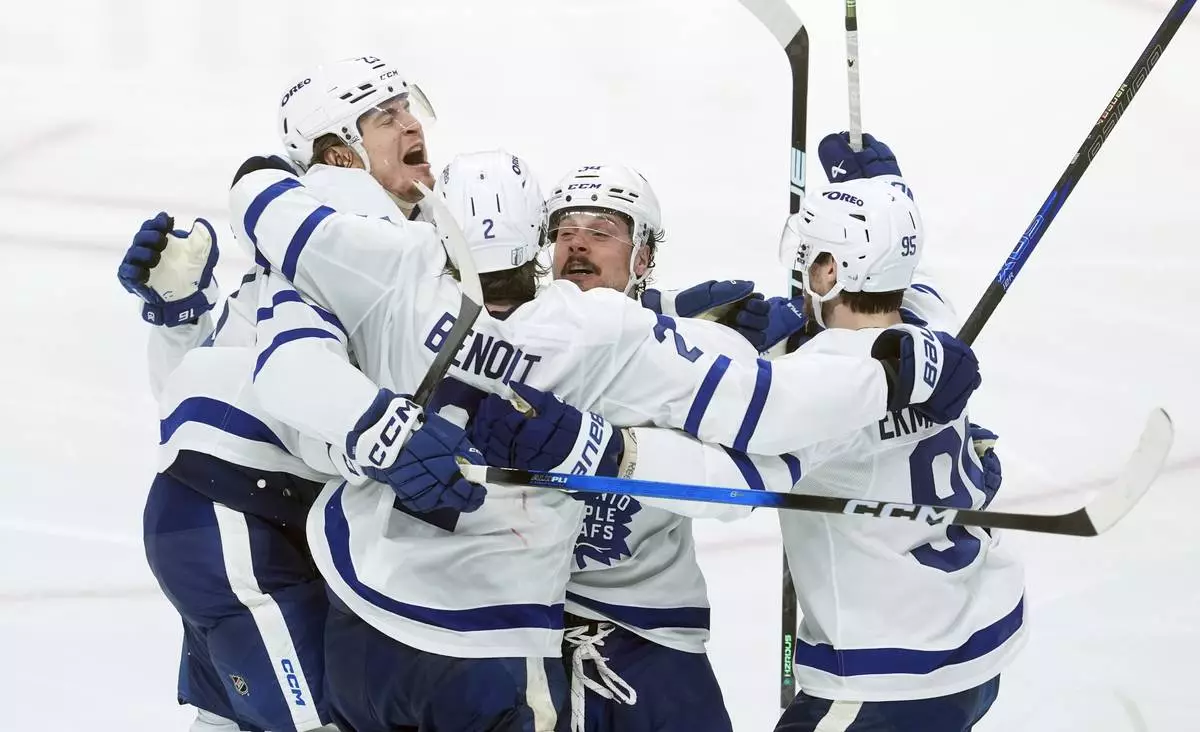 Toronto Maple Leafs' Matthew Knies, left, jumps into the arms of teammates as they celebrate after the winning goal against the Ottawa Senators in overtime of Game 3 in the first round of NHL hockey playoff series action in Ottawa, Ontario, Thursday, April 24, 2025. (Adrian Wyld/The Canadian Press via AP)