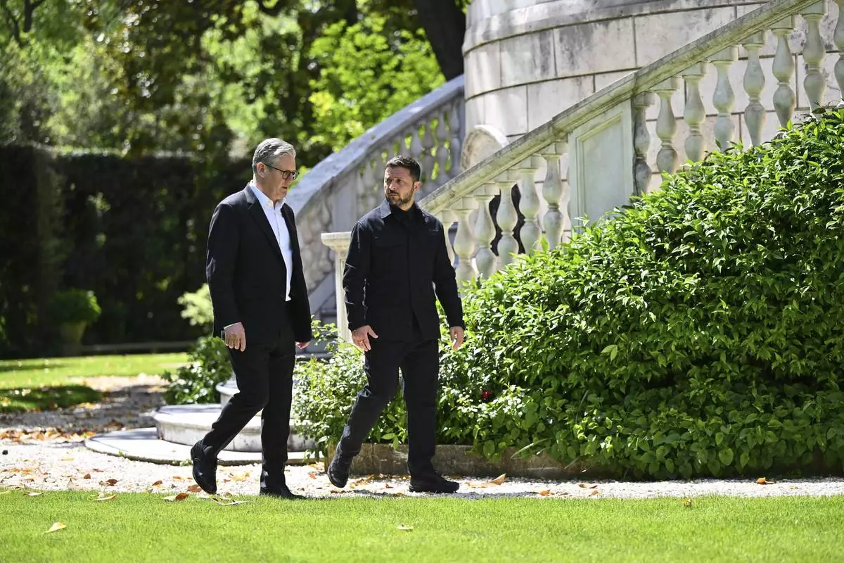 Britain's Prime Minister Keir Starmer, left, and President of Ukraine Volodymyr Zelenskyy walk through the gardens at The Villa Wolkonsky in Rome, Italy, during a bilateral meeting, Saturday April 26, 2025. (Marco M. Mantovani/Getty Images)